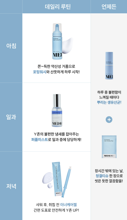 메디온 데일리 루틴 (포밍워시 & 퍼퓸미스트 & 이너케어젤 & 청결티슈 & 뿌리는 생유산균 사용 순서)