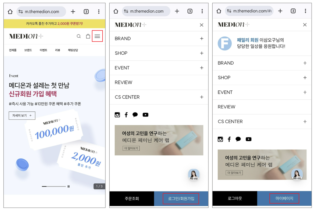 주문 취소, 반품, 교환은 모두 웹사이트 내 마이페이지에서 관리하실 수 있어요.공식 홈페이지 내에서 꼭 로그인 후 마이페이지로 이동해주세요!마이페이지 내에서 처리가 어려우실 경우 우측 아래 채팅 상담을 통해 문의 주시기 바랍니다. 마이페이지는 어디 있나요? 메디온 홈페이지 → 로그인 → 마이 페이지메디온 마이페이지, 주문 조회, 로그인 방법 주문 취소 반품 교환