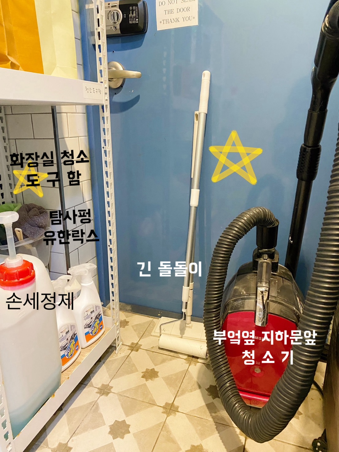 - 휴지 : 화장실 수납장 & 부엌 파란문 나가면(1234* ) 통로에 재고 있음