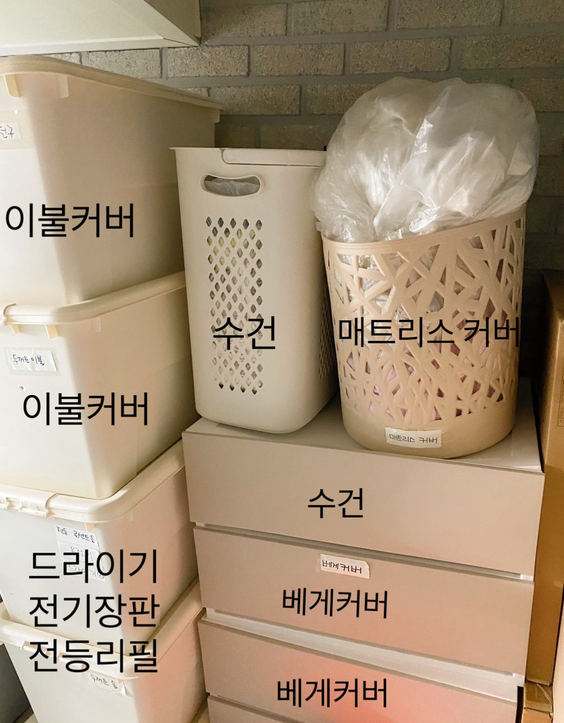 - 침구류(예비) : 1층 부엌 파란문 나가면 (1234* ) 통로에 침구류 흰색 박스 & 흰색수납장