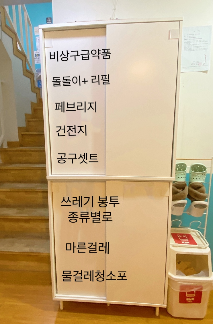 - 물걸레청소포 : 1층 거실 흰색 수납장 왼쪽 위