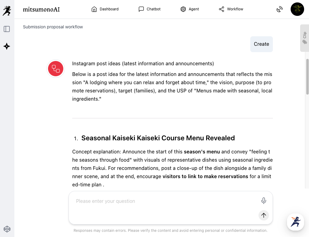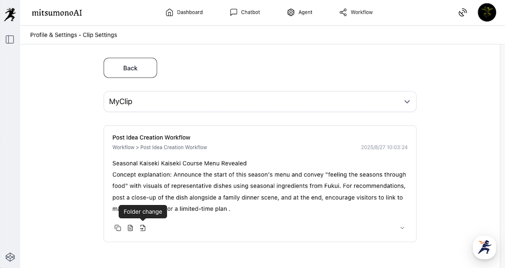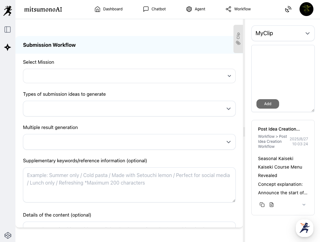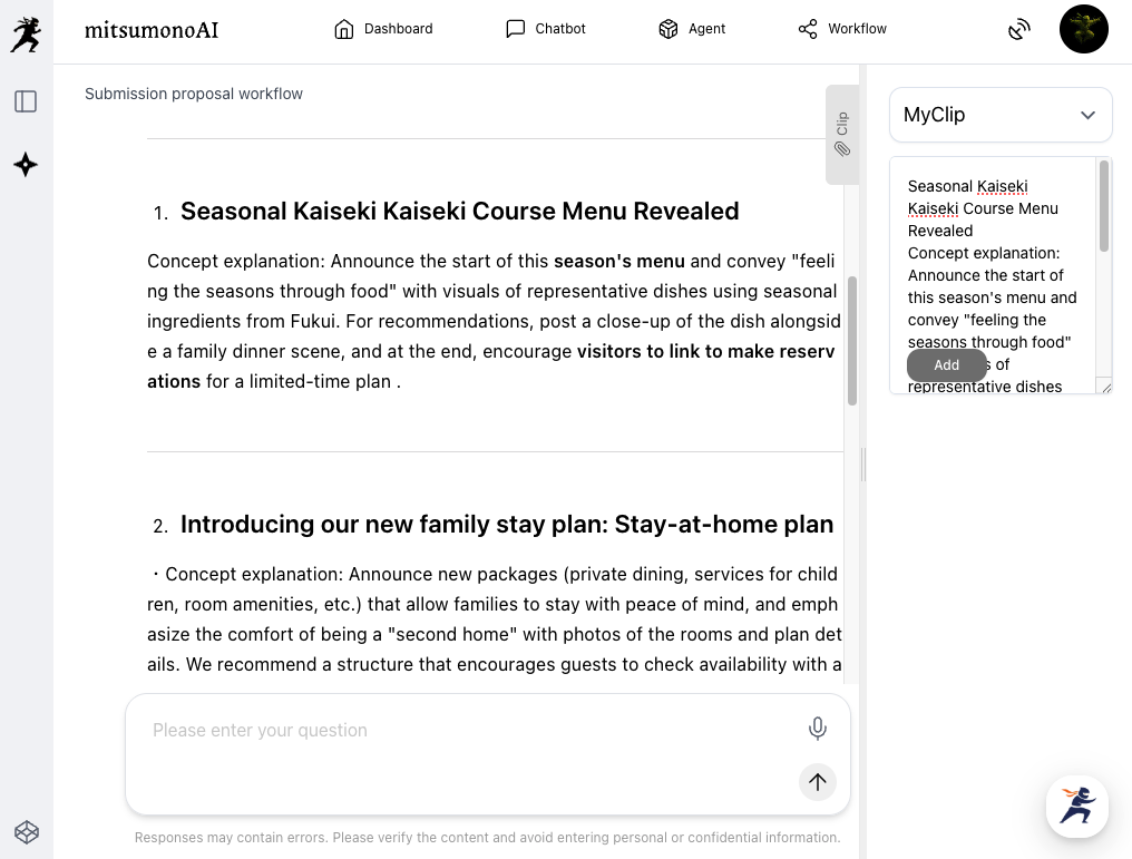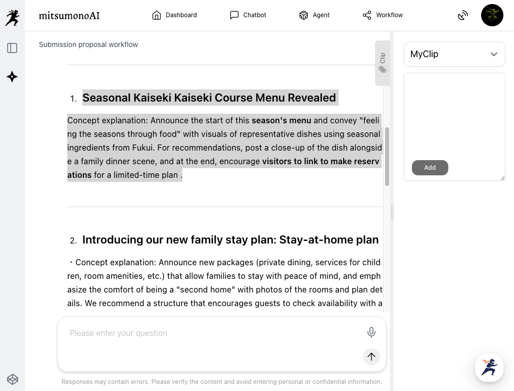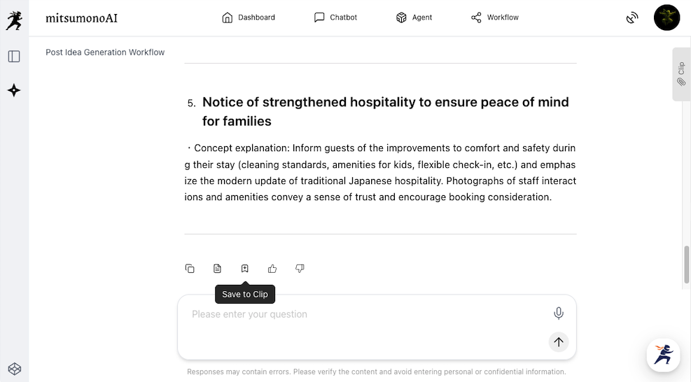 A "Clip" is a feature that allows you to temporarily save necessary parts of AI output results like a memo, or organize them for easy reuse later. While mitsumonoAI also accumulates past dialogue history, there may be instances where it takes time to find the necessary information from the history, or you may only want to utilize a part of the output result.
