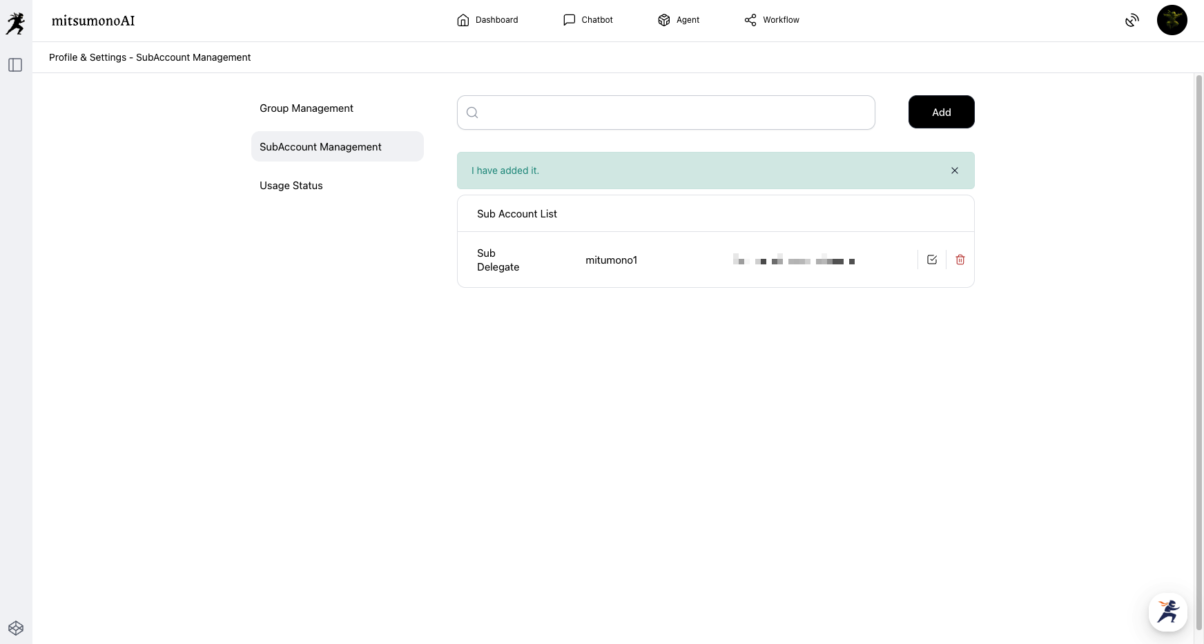 The notification "Added." will be displayed, and the sub-account addition is complete.