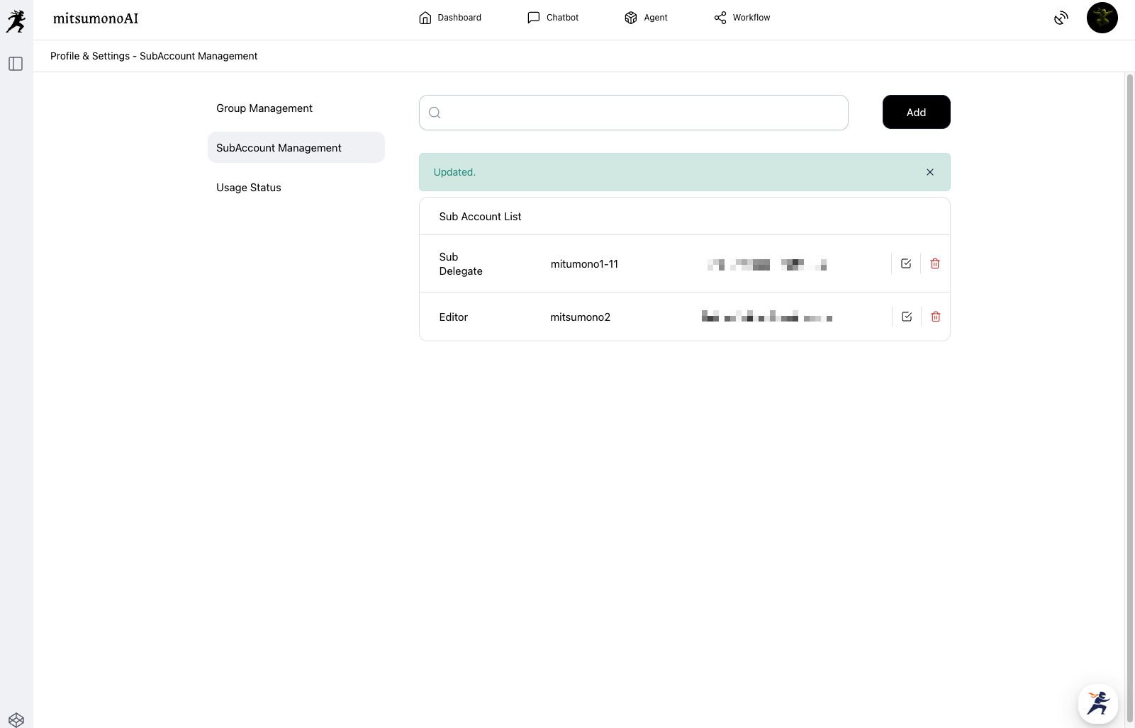 The notification "Updated." will be displayed, and the sub-account editing is complete.