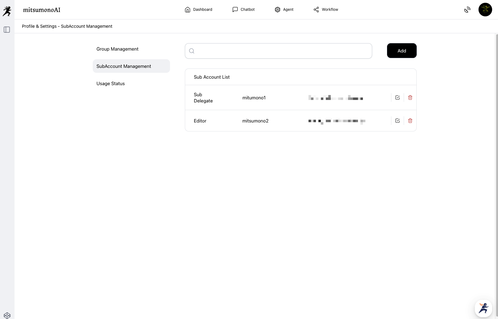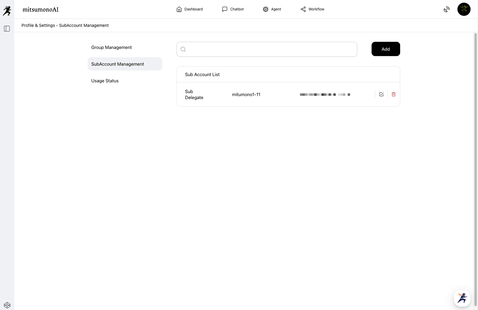 Click "Sub-Account Management" from the menu on the left side of the screen. The Sub-Account List screen will be displayed. Click "Add" in the top-right corner of the screen to display the "Add Sub-Account" screen.