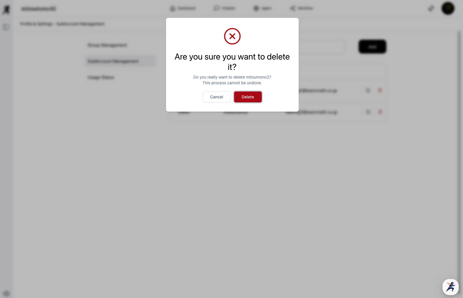 From the Sub-Account List, click the Delete Icon in the row of the relevant user. A final confirmation, "Are you sure you want to delete this?" will be displayed. Confirm and click "Delete."