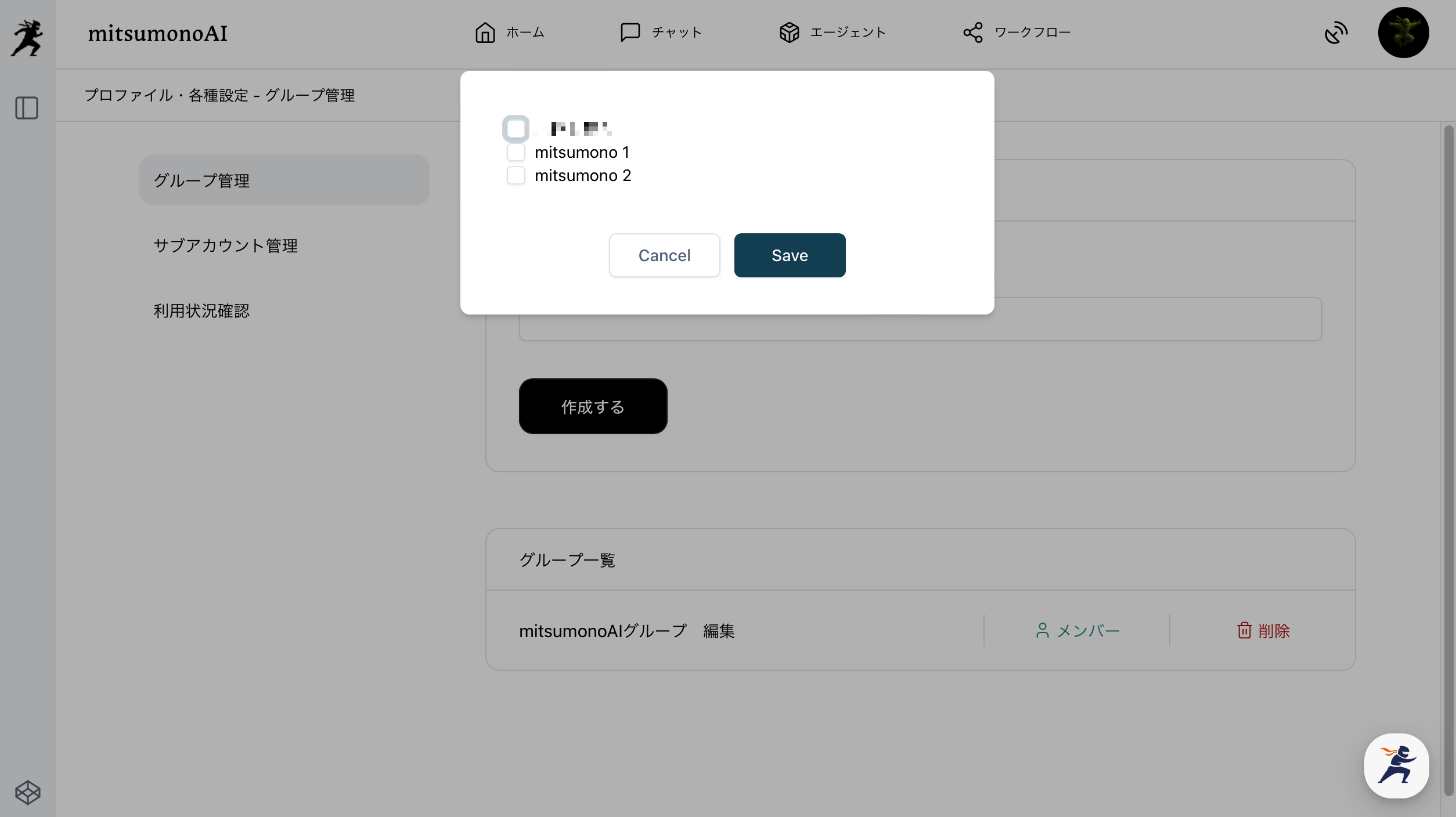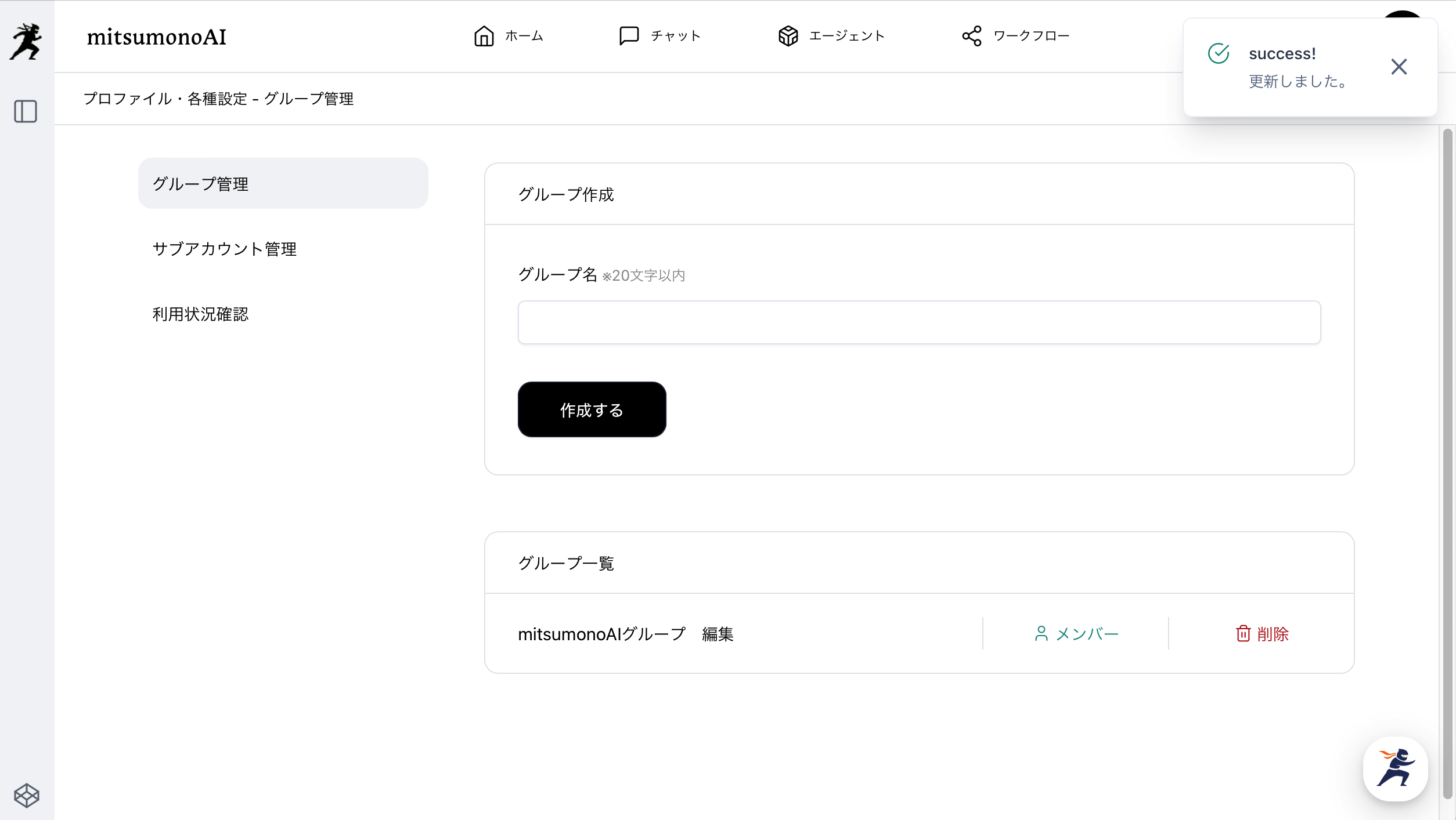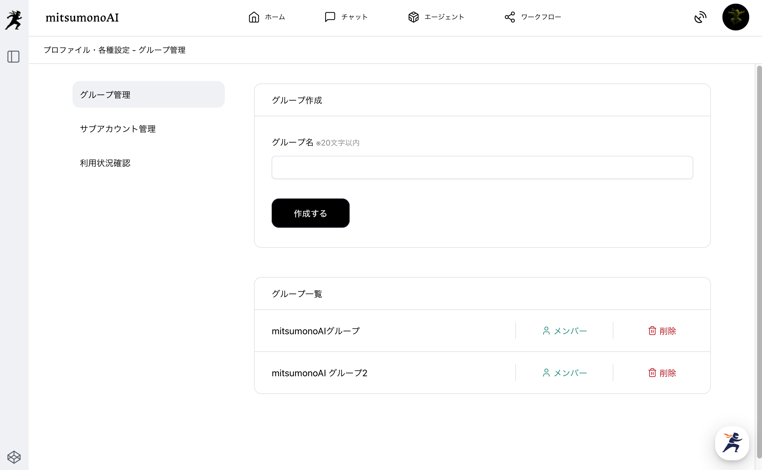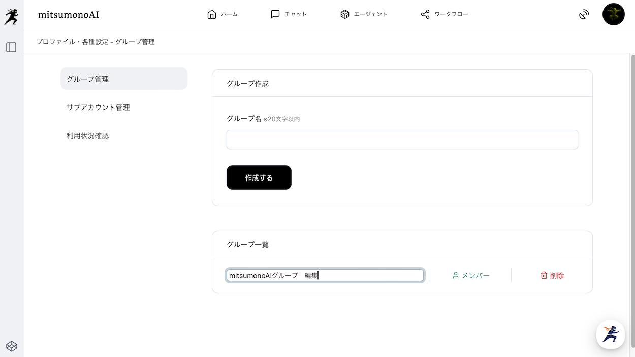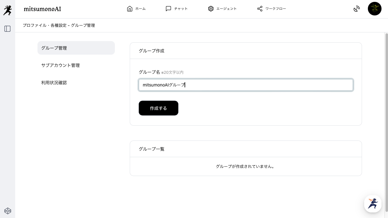 グループ管理画面でグループ名(20文字以内)を入力し、「作成する」をクリックしてください。