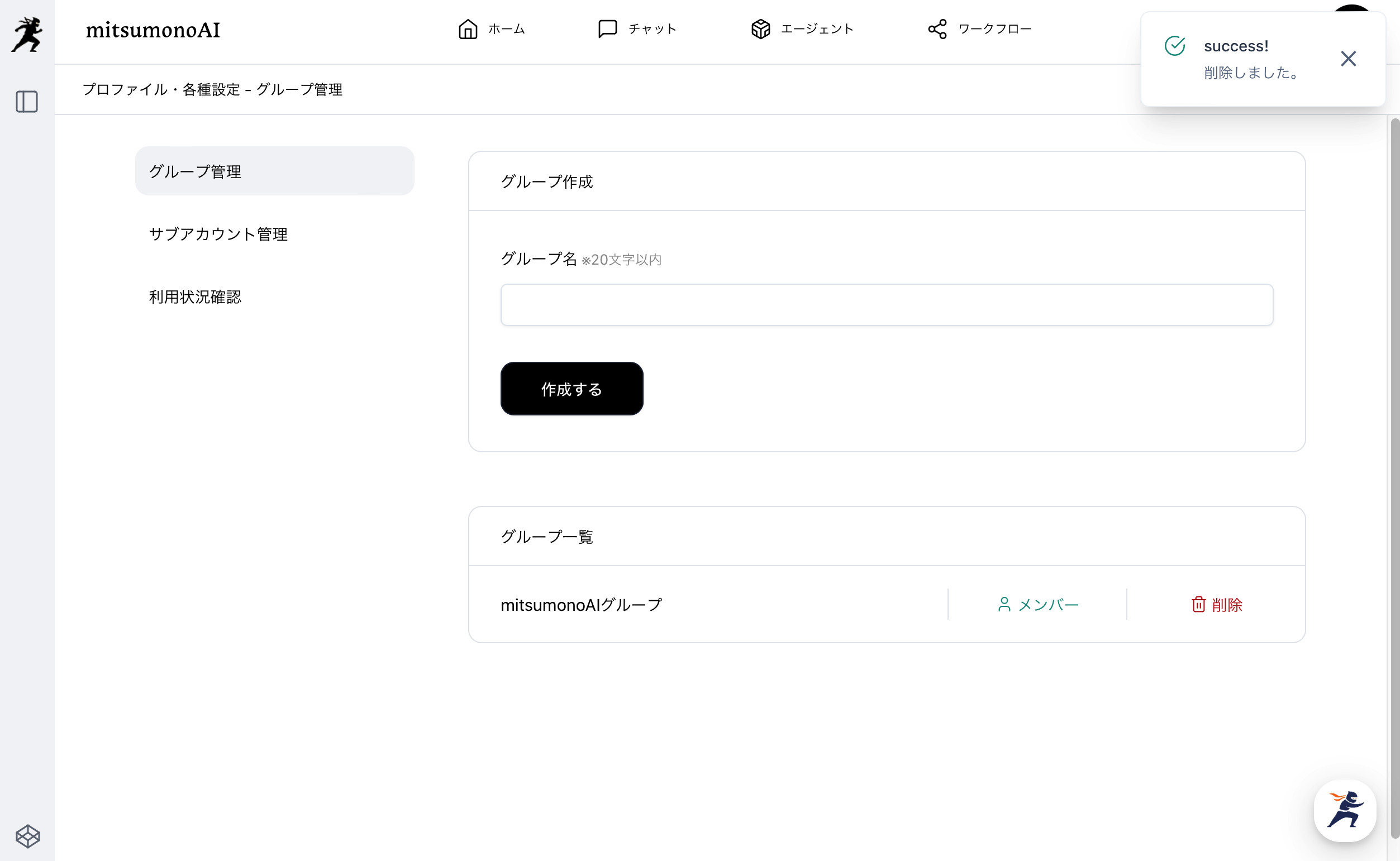 "削除しました。"の通知が表示され、削除したグループがグループ一覧から削除されたら完了です。