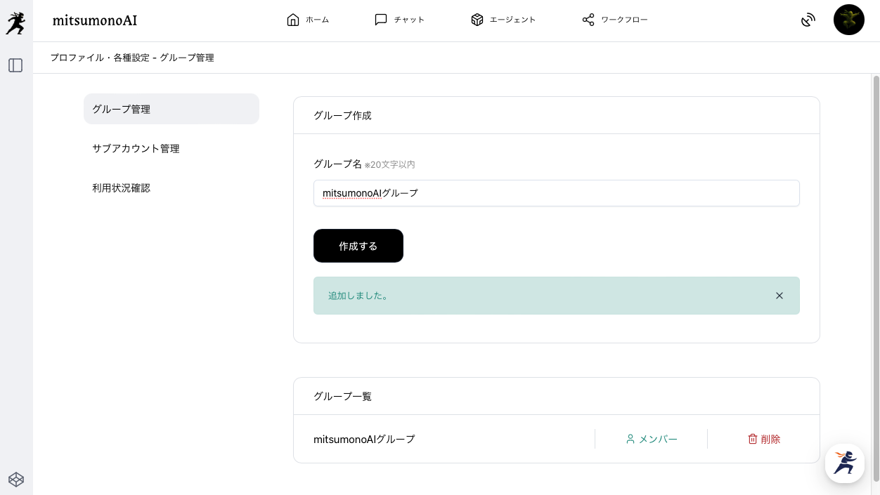 「追加しました。」という通知が表示され、「グループ一覧」に作成したグループが表示されたら完了です。