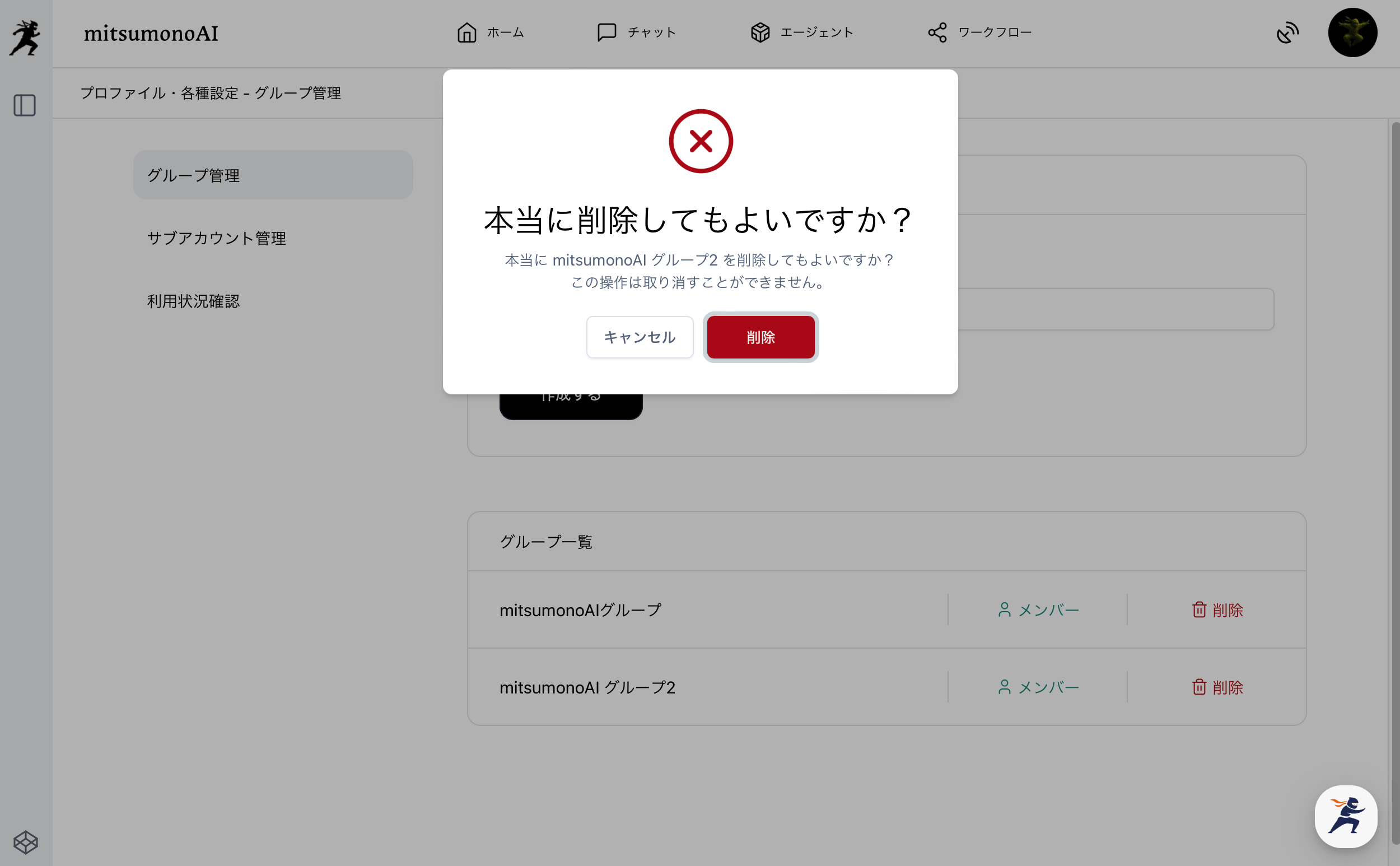 「削除しました。」の通知が表示され、グループ一覧から削除されたら完了です。