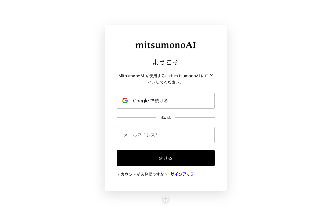 表示された画面で「ログイン」を選択後、「メールアドレス」欄に登録したメールアドレスを入力し、 [続ける] をクリックします。