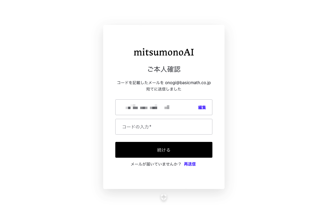 入力したアドレス宛に「認証コード」が届きます。そのコードを画面に入力し、 [続ける] をクリックします。