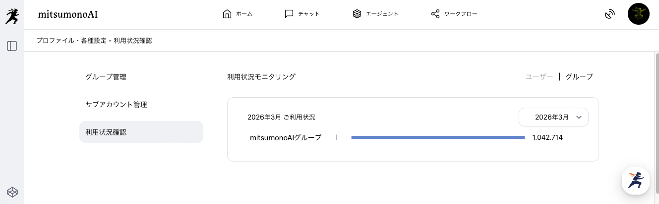モニタリング: 代表アカウントは、メンバーやグループごとの利用状況を確認できます。
