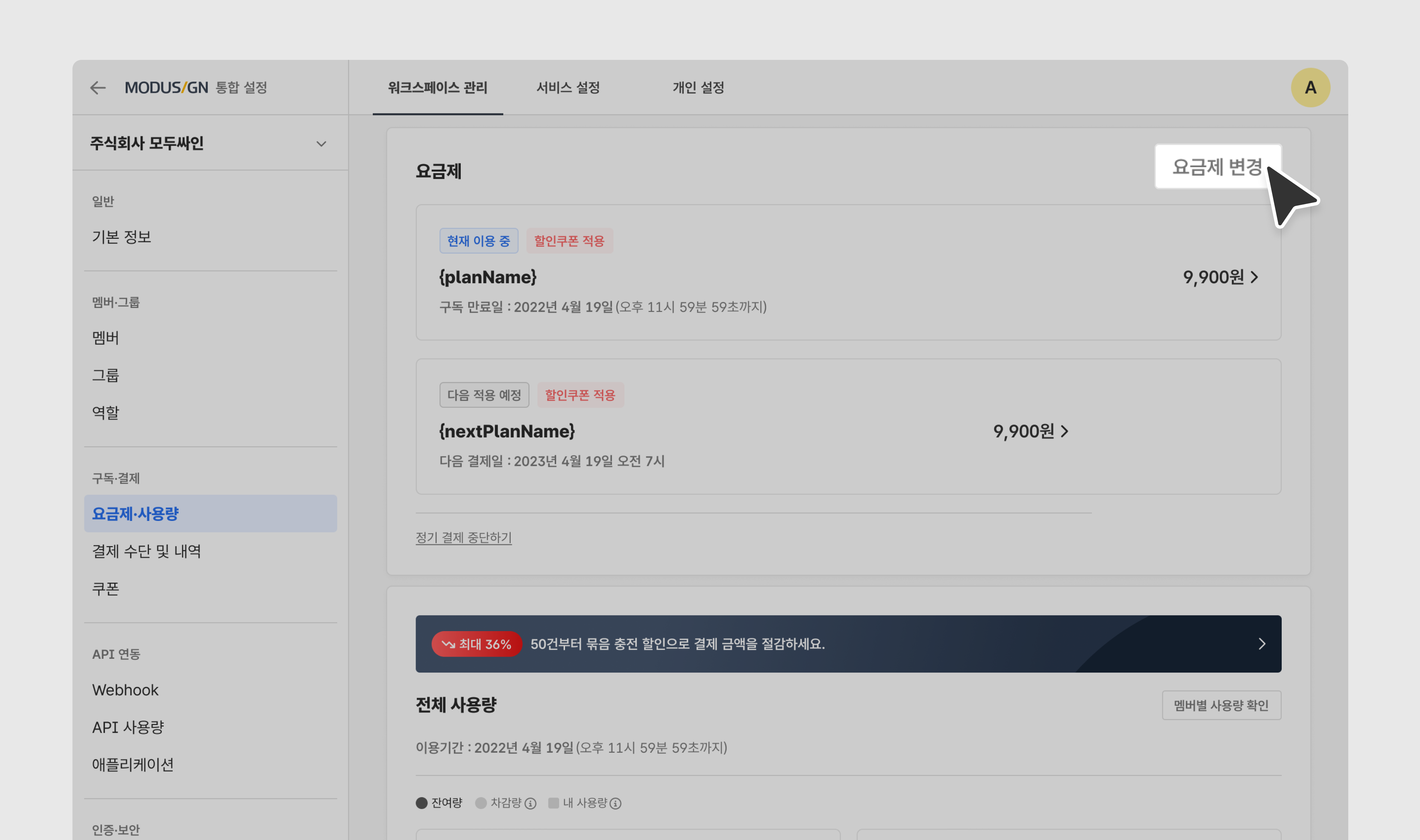 우측 상단 통합설정 ⚙︎ 버튼 클릭 > 워크스페이스 관리 > 요금제·사용량 메뉴를 클릭합니다.