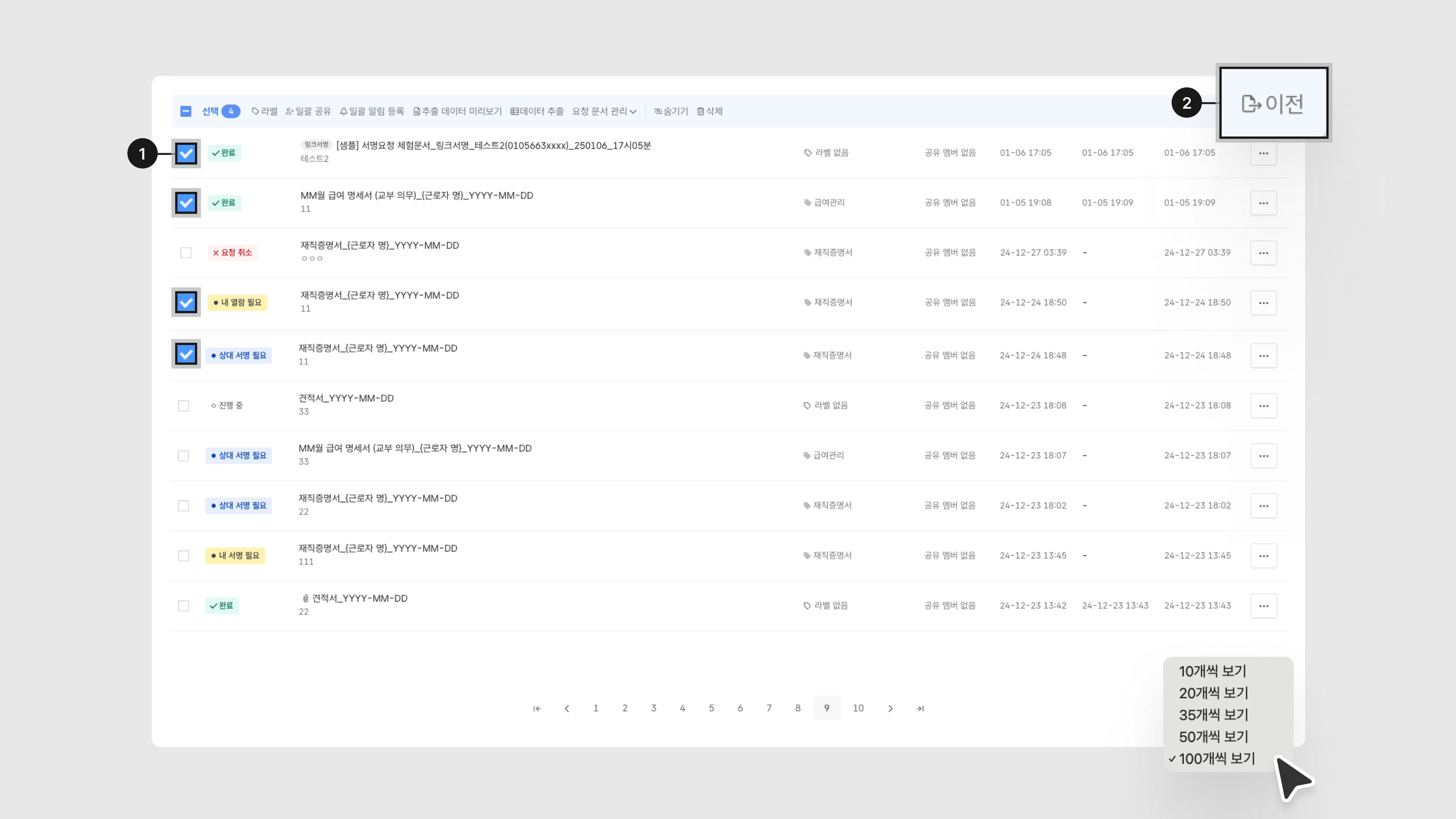 문서 목록 우측 하단에서 보기 설정을 [100개씩 보기]로 수정하면 한 번에 최대 100개씩 이전할 수 있습니다.
