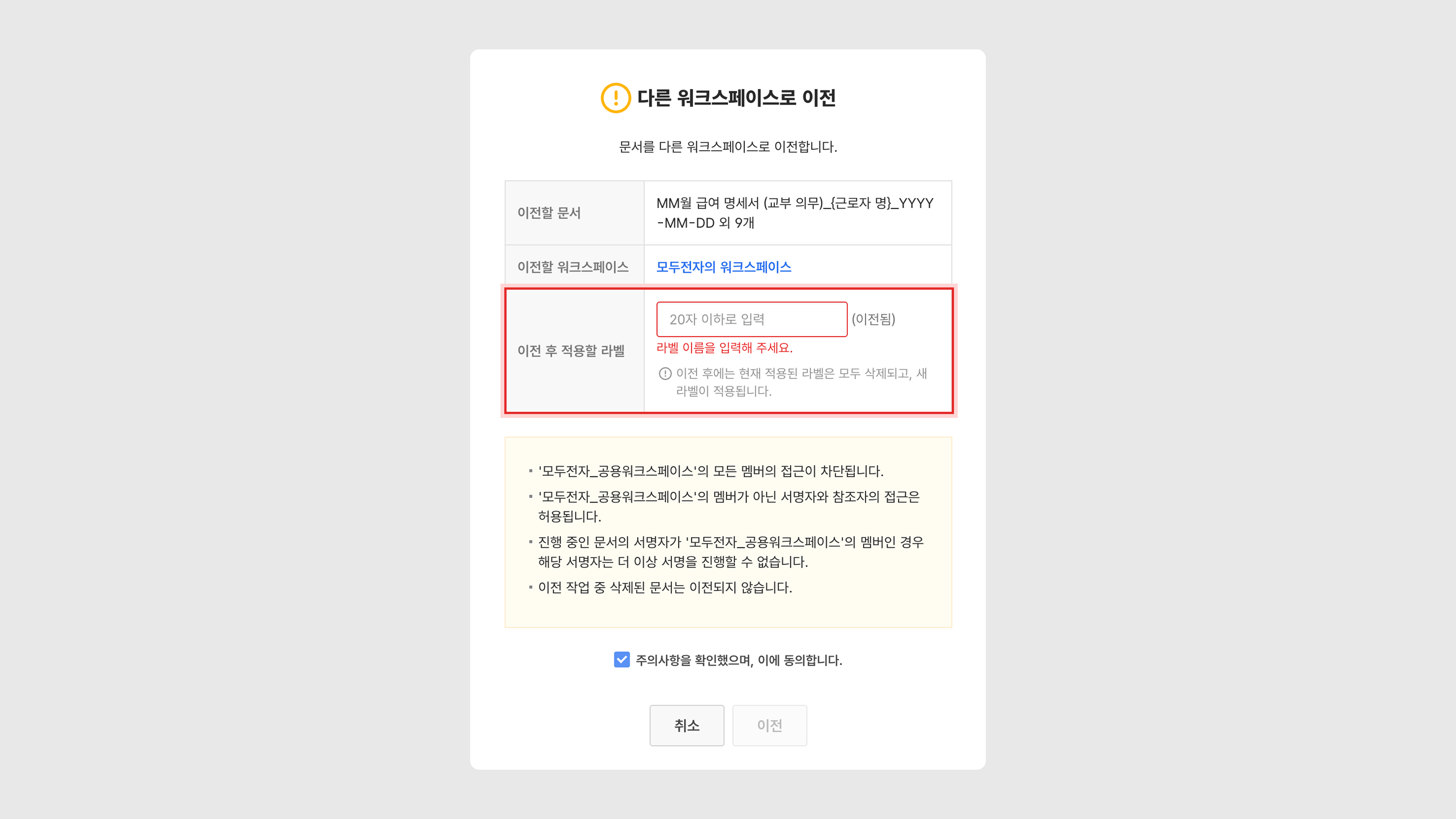 1. 워크스페이스로 이전 시, 문서 이전은 문서에 설정할 라벨명을 입력합니다.
