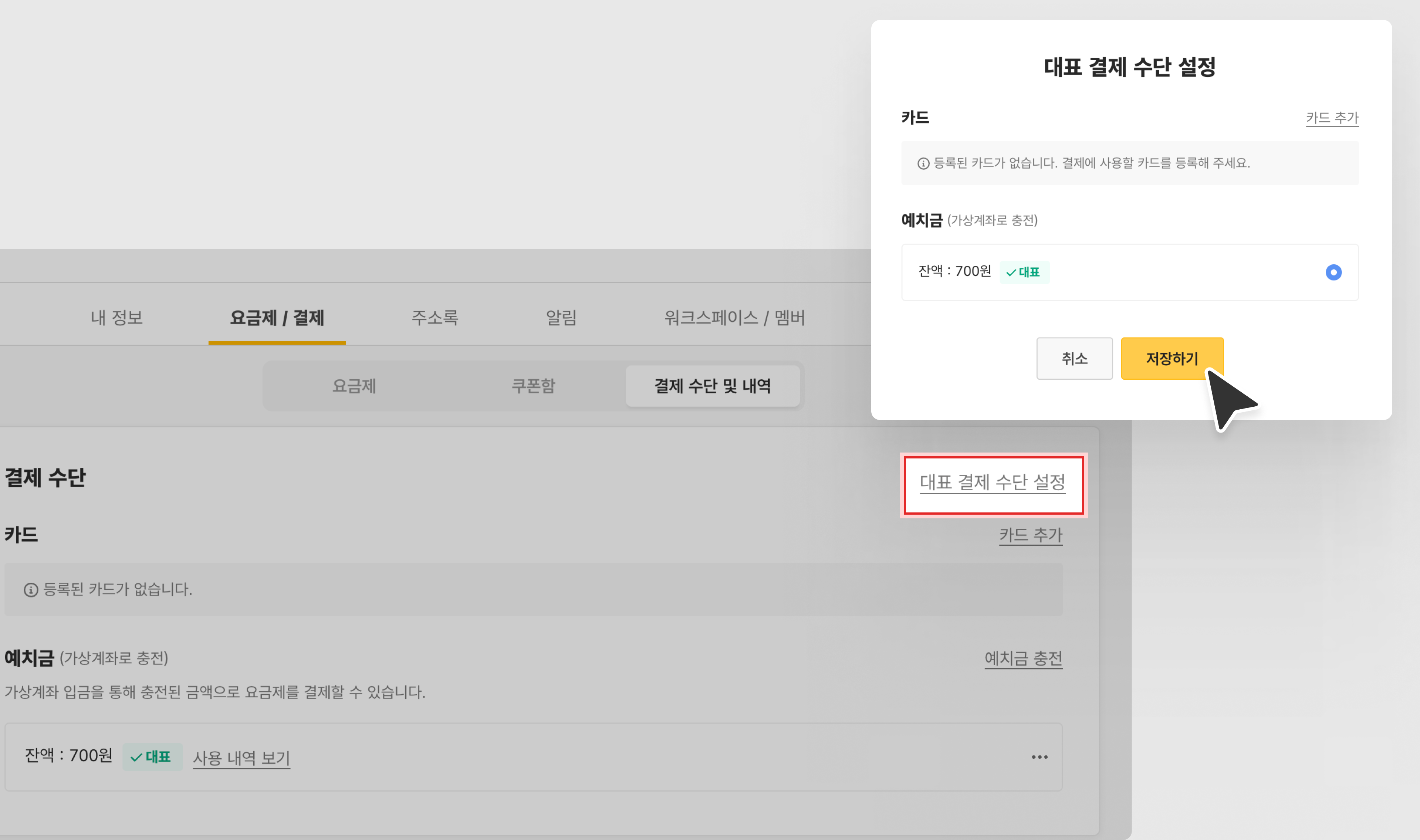[카드 추가]를 통해 카드 등록 또는 예치금 충전을 진행 후, [저장하기] 버튼을 눌러 대표 결제 수단 설정이 완료됩니다.