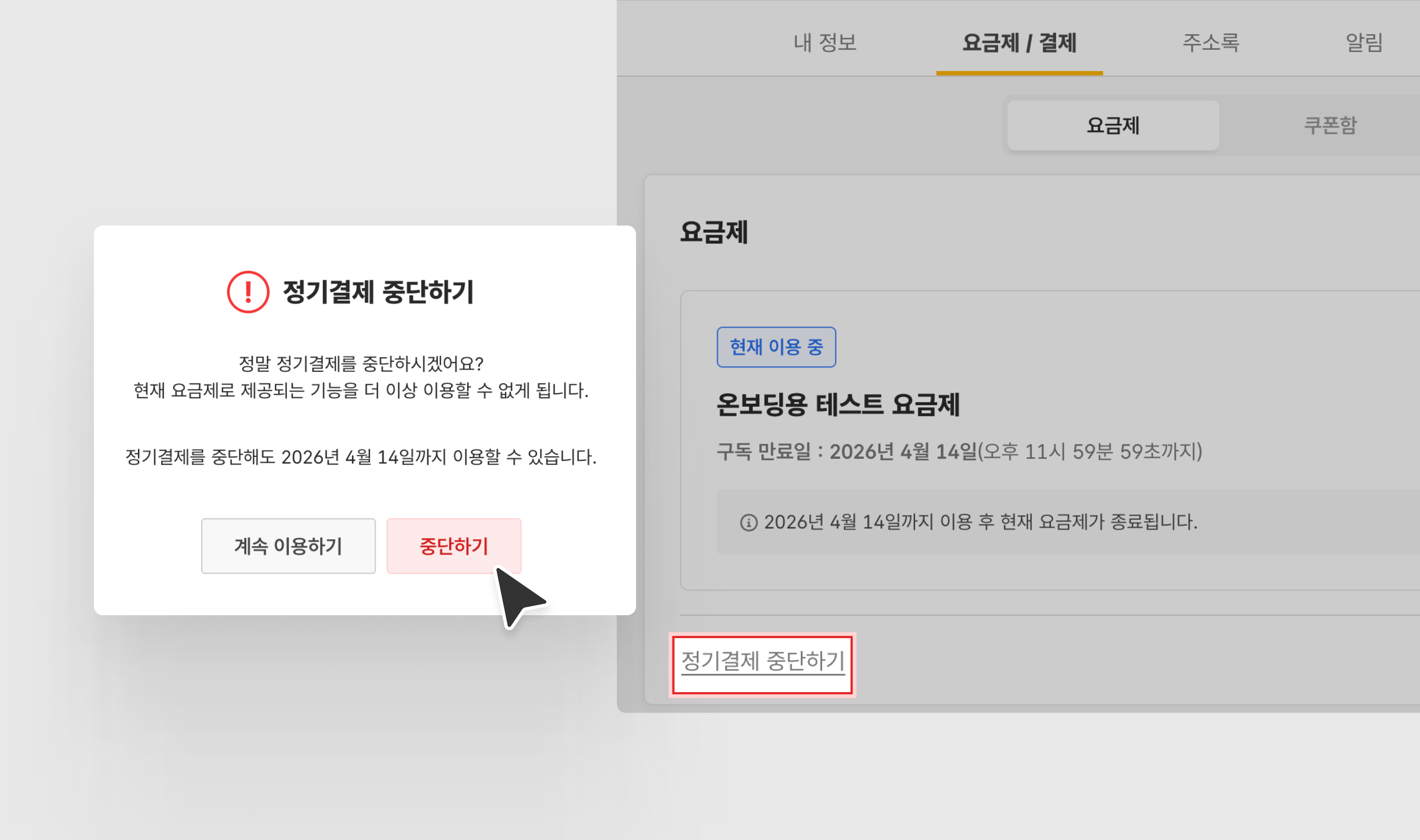 정기 결제 중단 알림이 나타나면, 내용을 숙지한 후 [중단하기] 버튼을 클릭합니다.