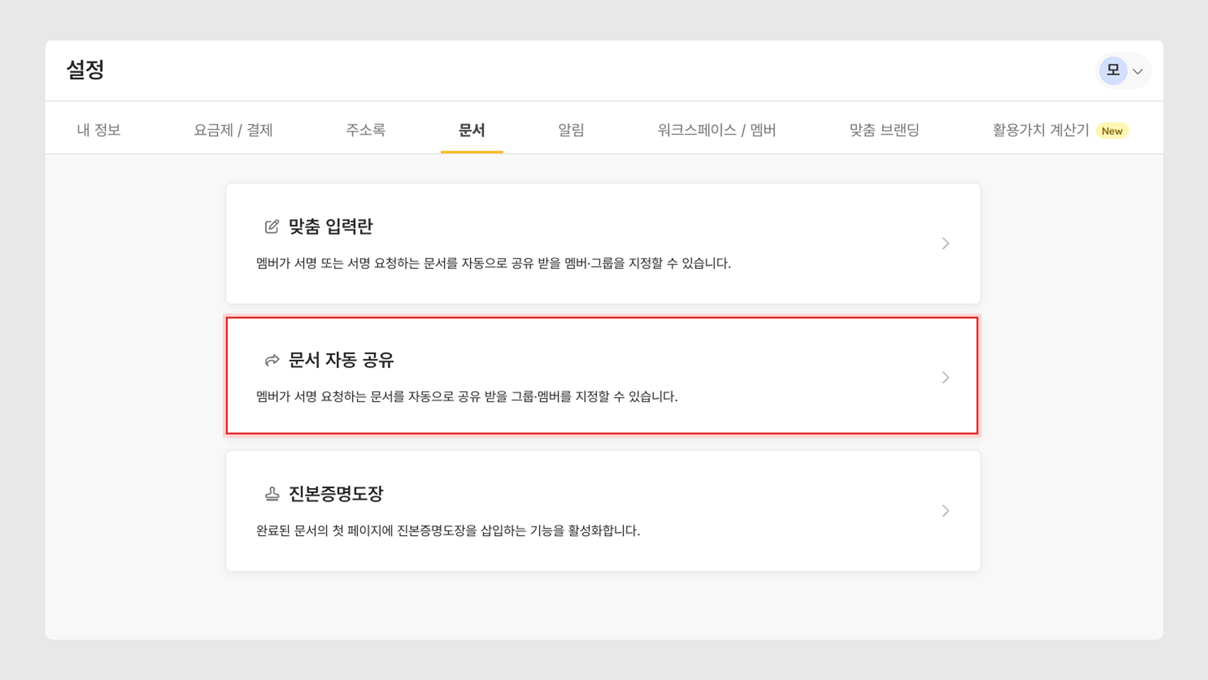 설정 > 문서 > 문서 자동 공유를 클릭합니다.