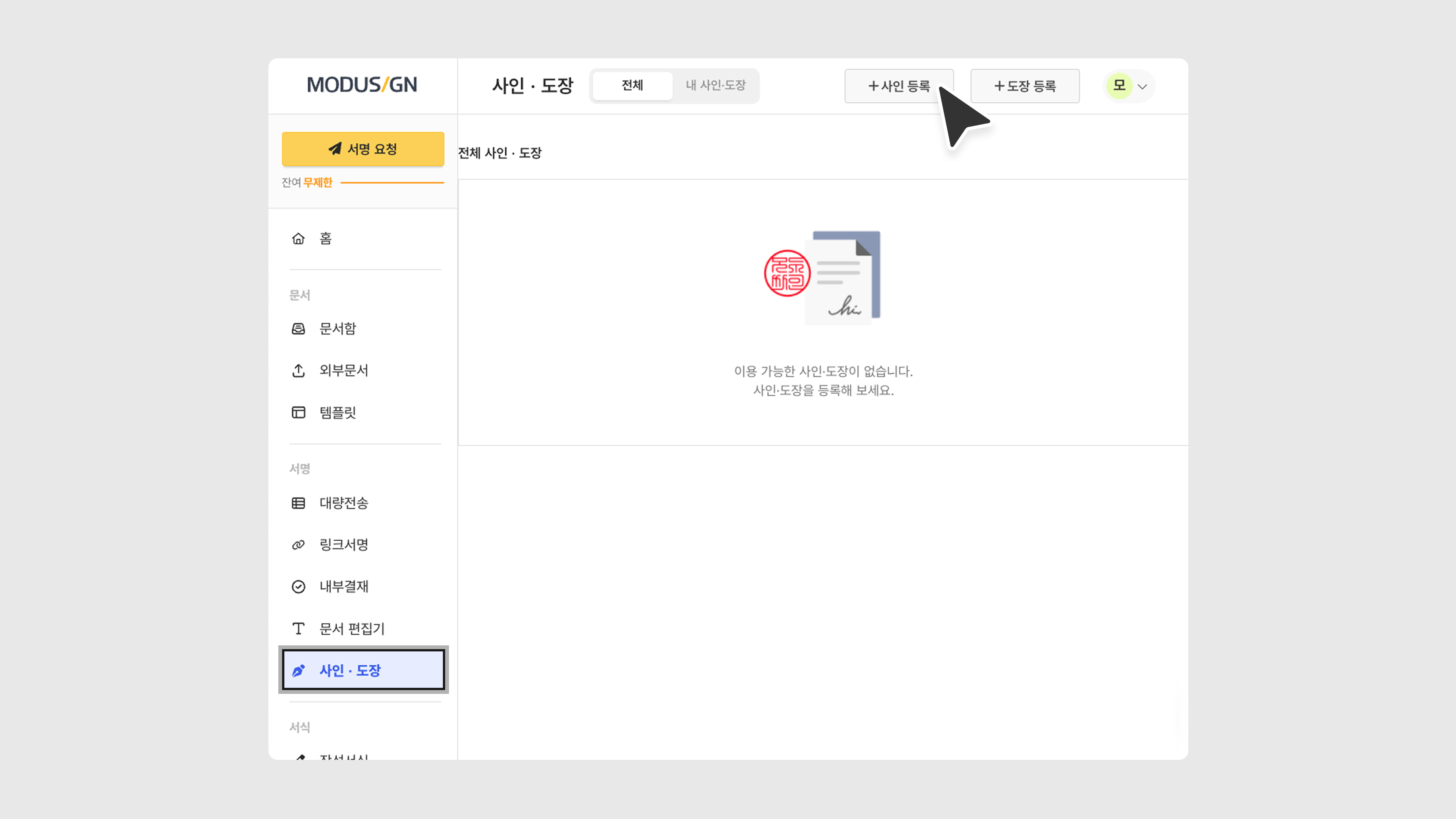 모두싸인에 로그인 한 후, 좌측의 [사인/도장] 메뉴를 클릭합니다.