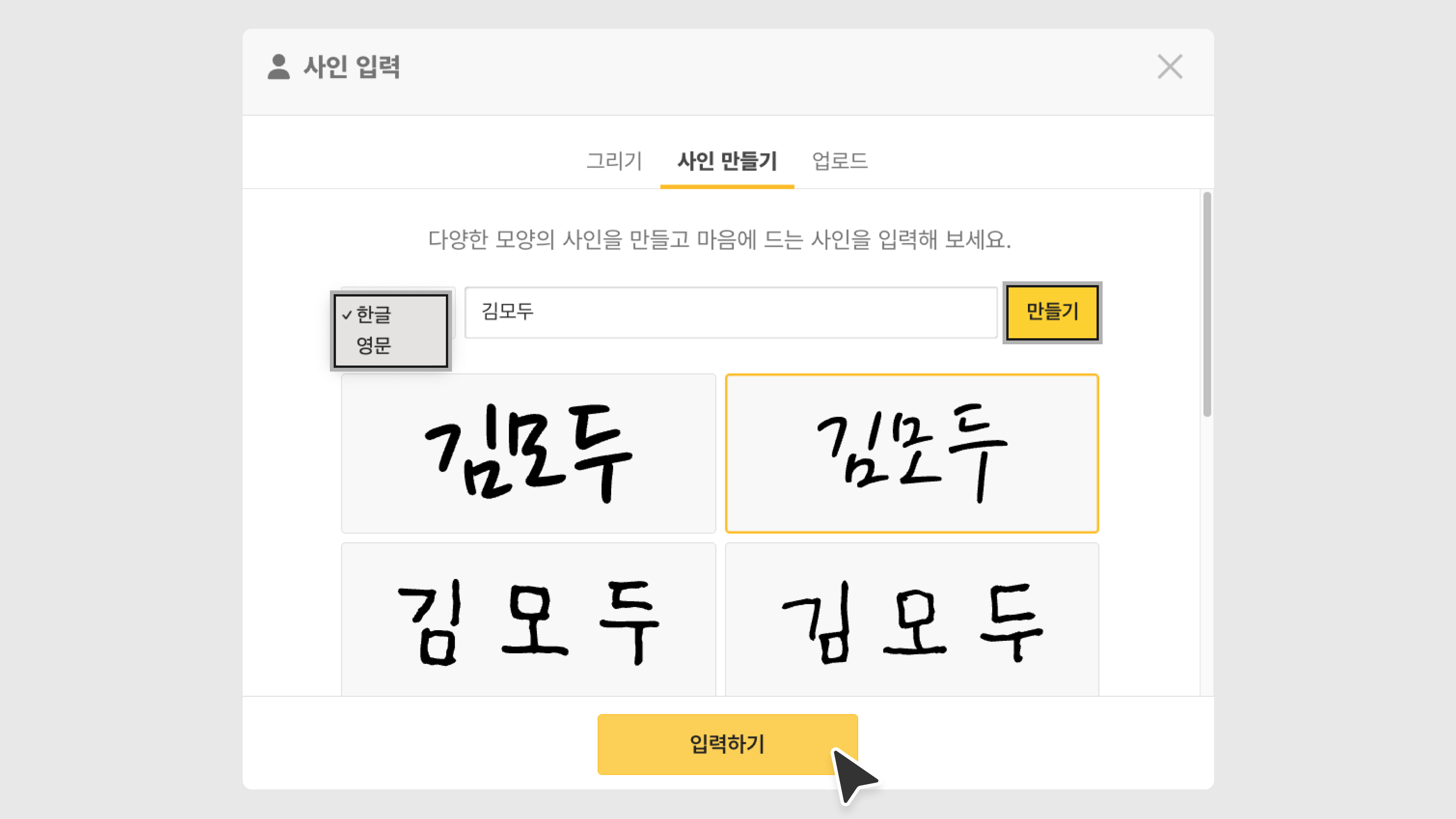 사인 만들기 : 한글 또는 영문 사인을 만들 수 있습니다.