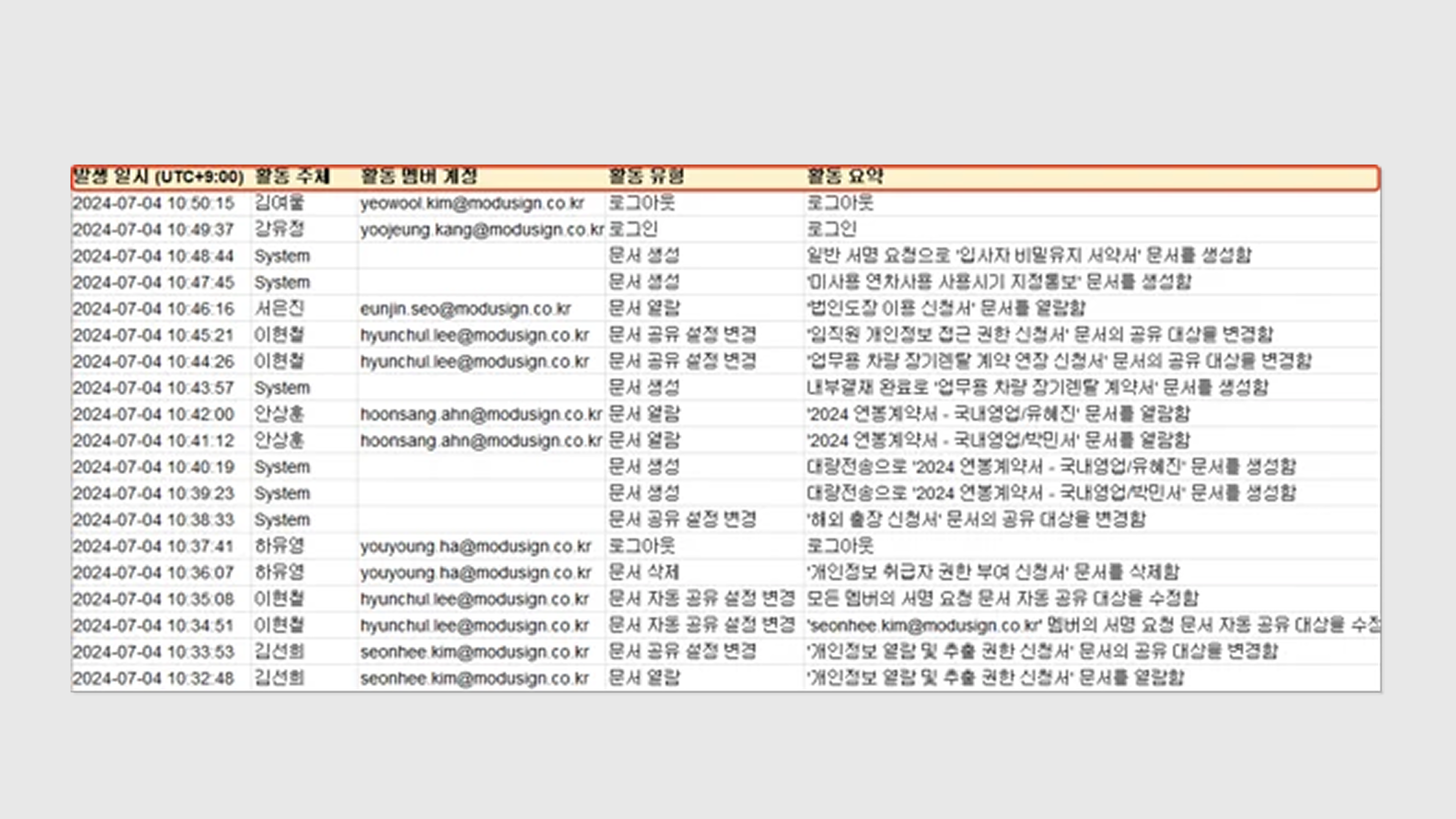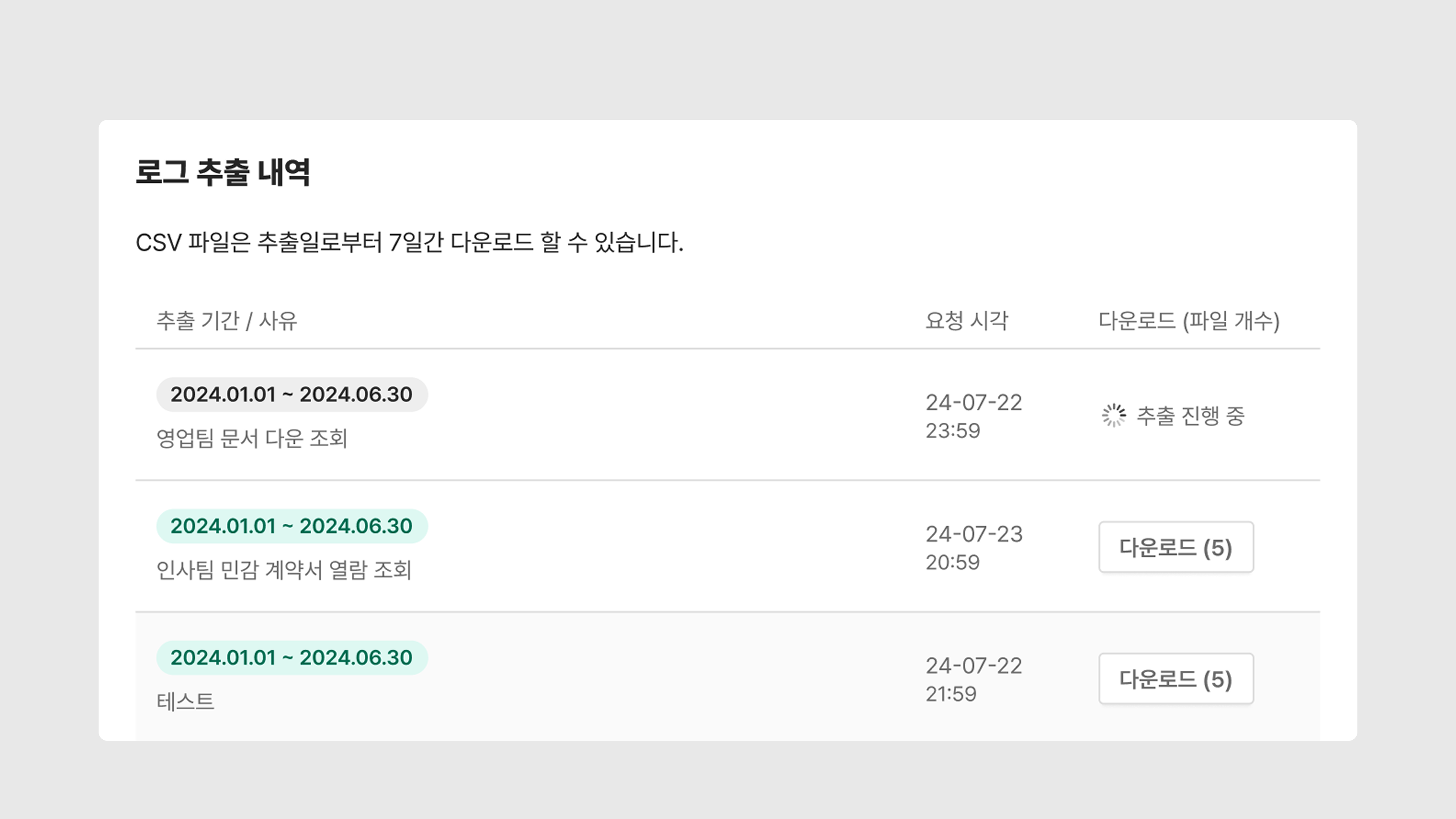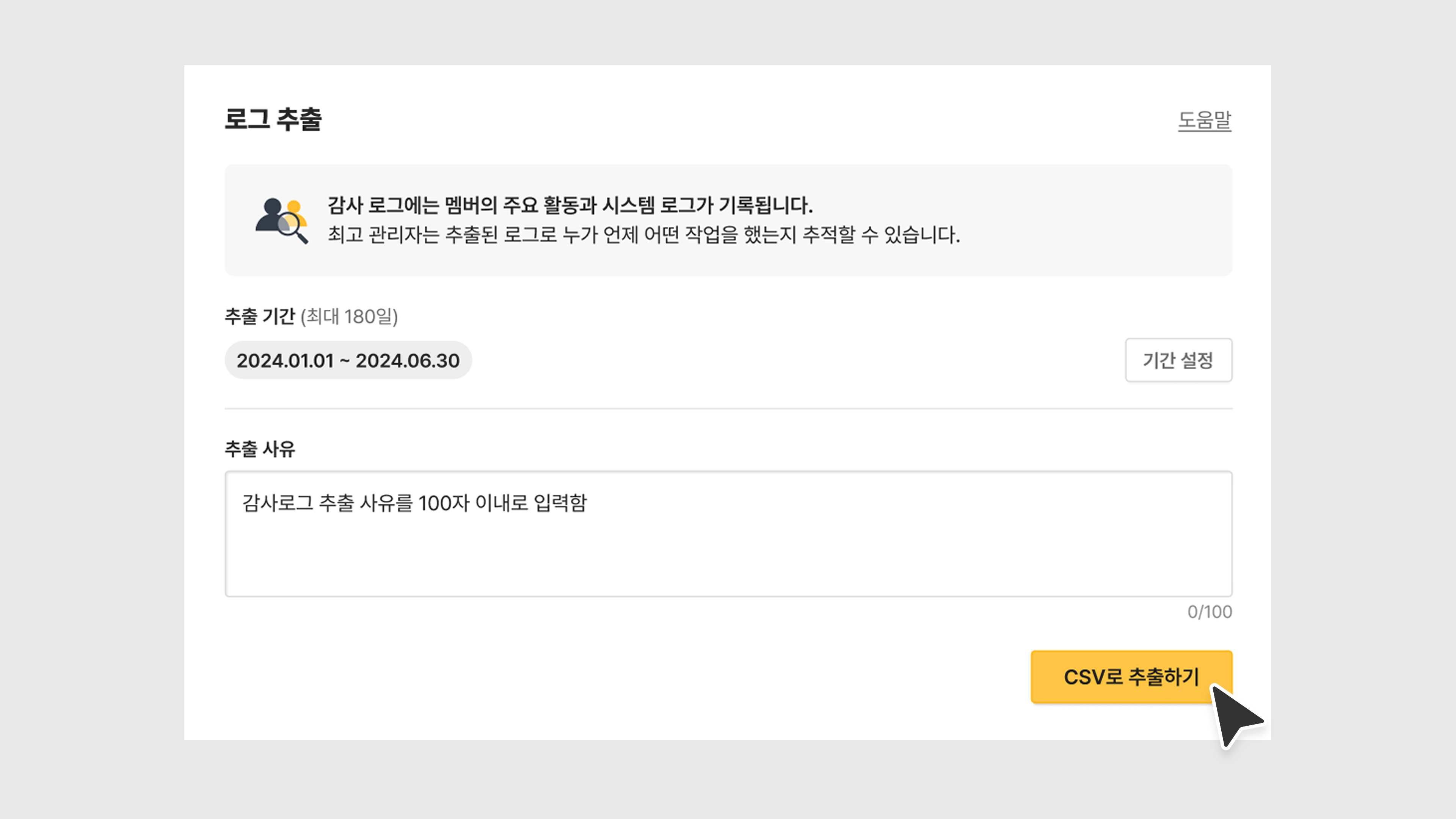 최고 관리자 외의 멤버는 감사 로그를 추출하거나 추출 내역을 조회할 수 없습니다.