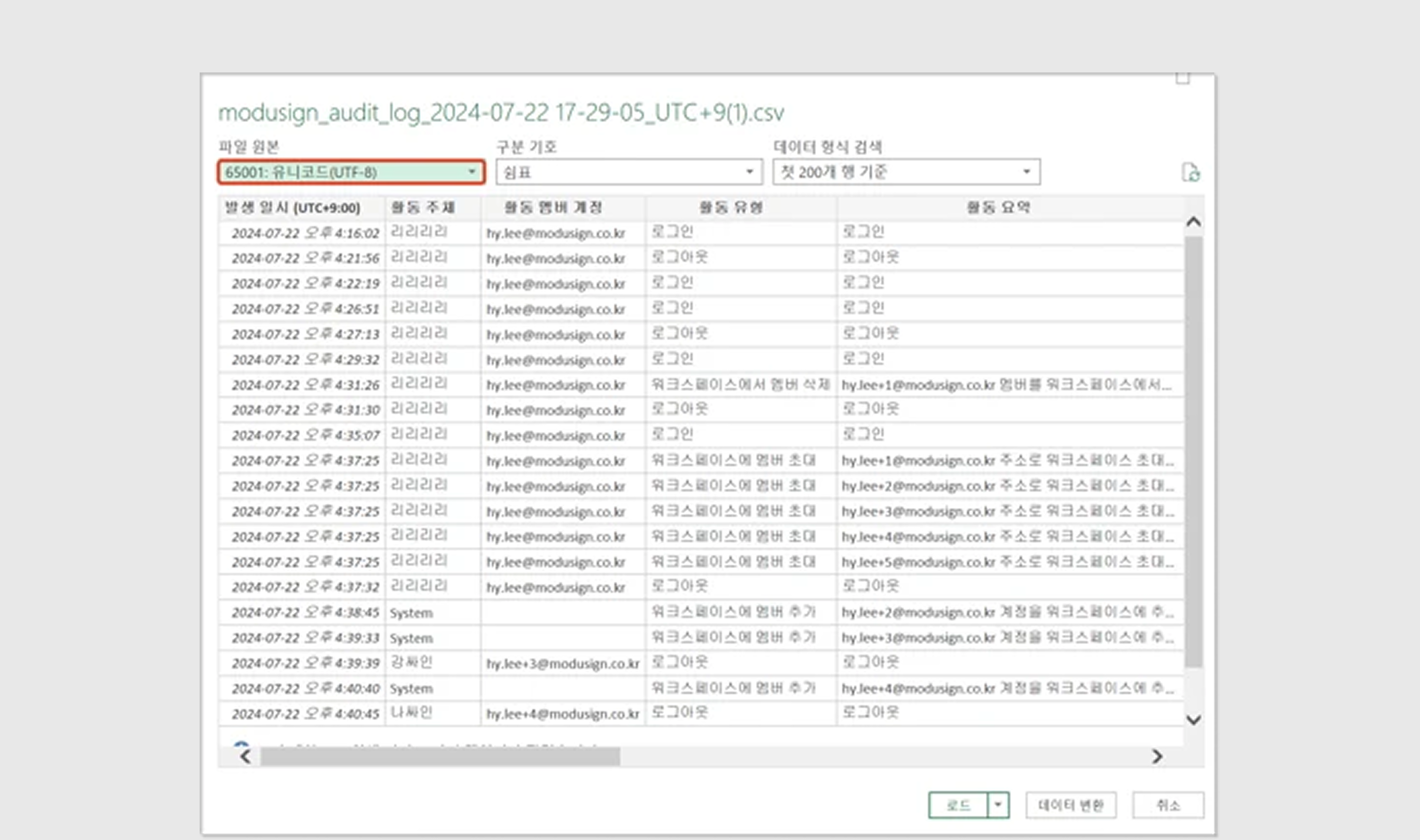 감사 로그 추출 후 CSV 파일을 엑셀(기타 텍스트 에디터)로 열었을 때 한글이 정상적으로 나타나지 않을 경우, 아래 방법으로 시도 부탁드립니다.