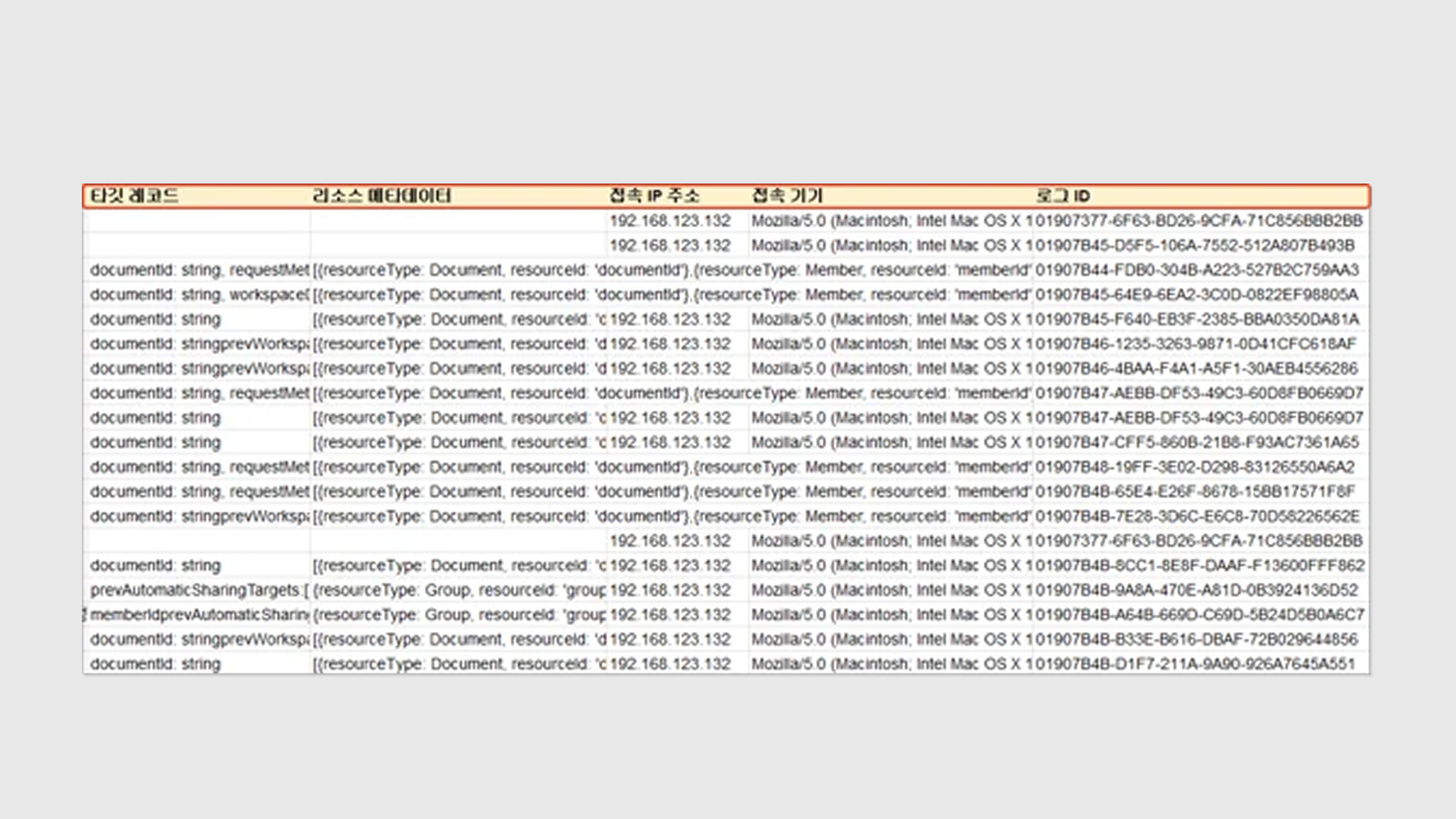 (I열) 접속 기기: 이벤트의 주체가 워크스페이스 멤버인 경우 접속한 기기의 운영체제와 브라우저 정보