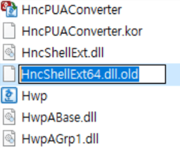 파일 목록 중 HncShellExt64.dll 파일을 찾아 .old를 붙여줍니다. HncShellExt64.dll → HncShellExt64.dll.old
