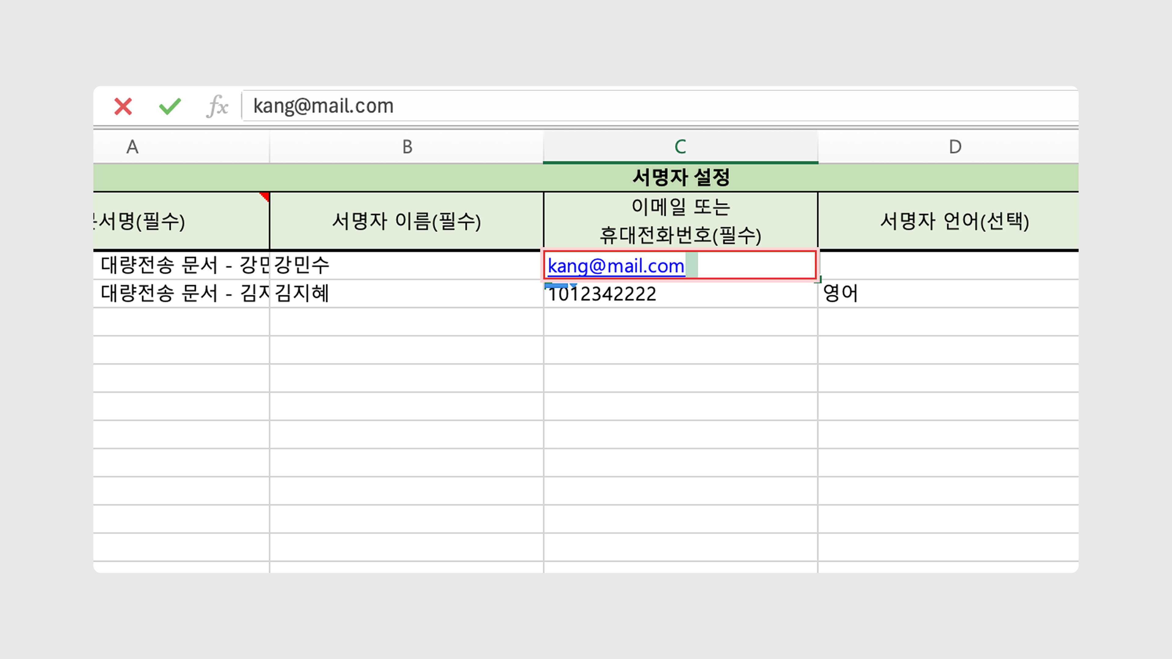 모든 서명자 정보를 미리 입력해 놓으면 안됩니다. 반드시 하나의 서명자 정보는 이름, 이메일 등의 정보를 비워놔야, 추후 각기 다른 참여자들의 정보들을 엑셀에서 입력할 수 있습니다.