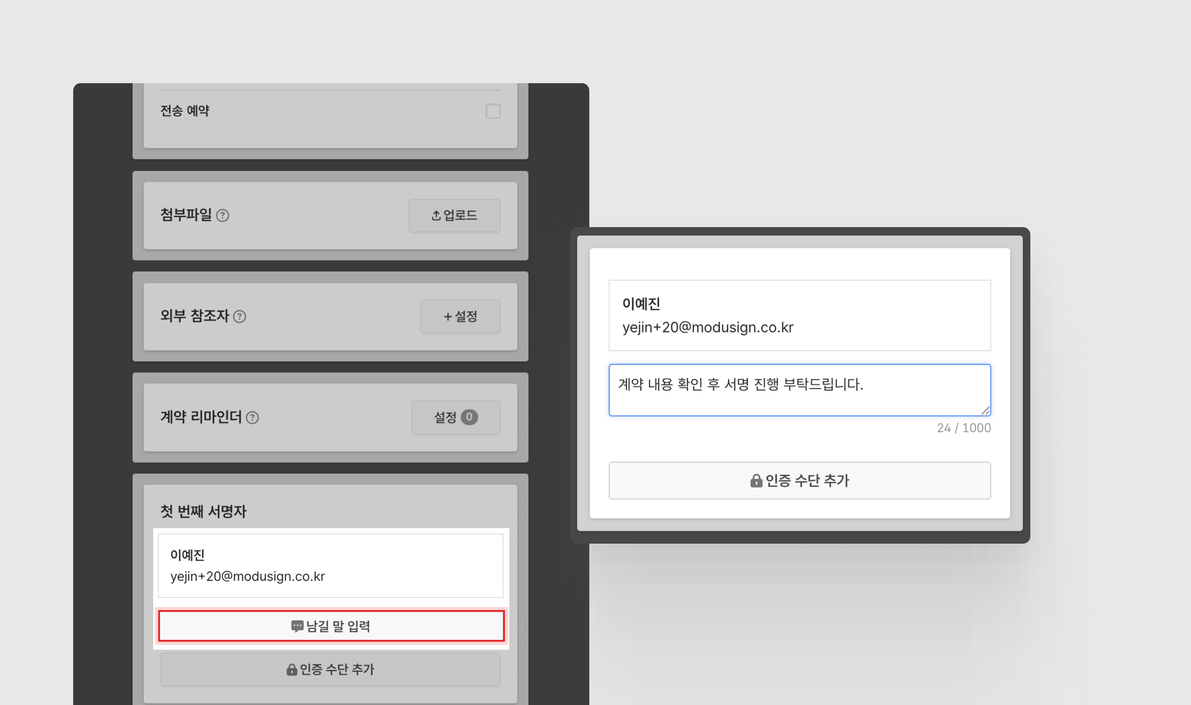 서명 요청 시 각 서명자(상대방)에게 메시지를 남길 수 있습니다.