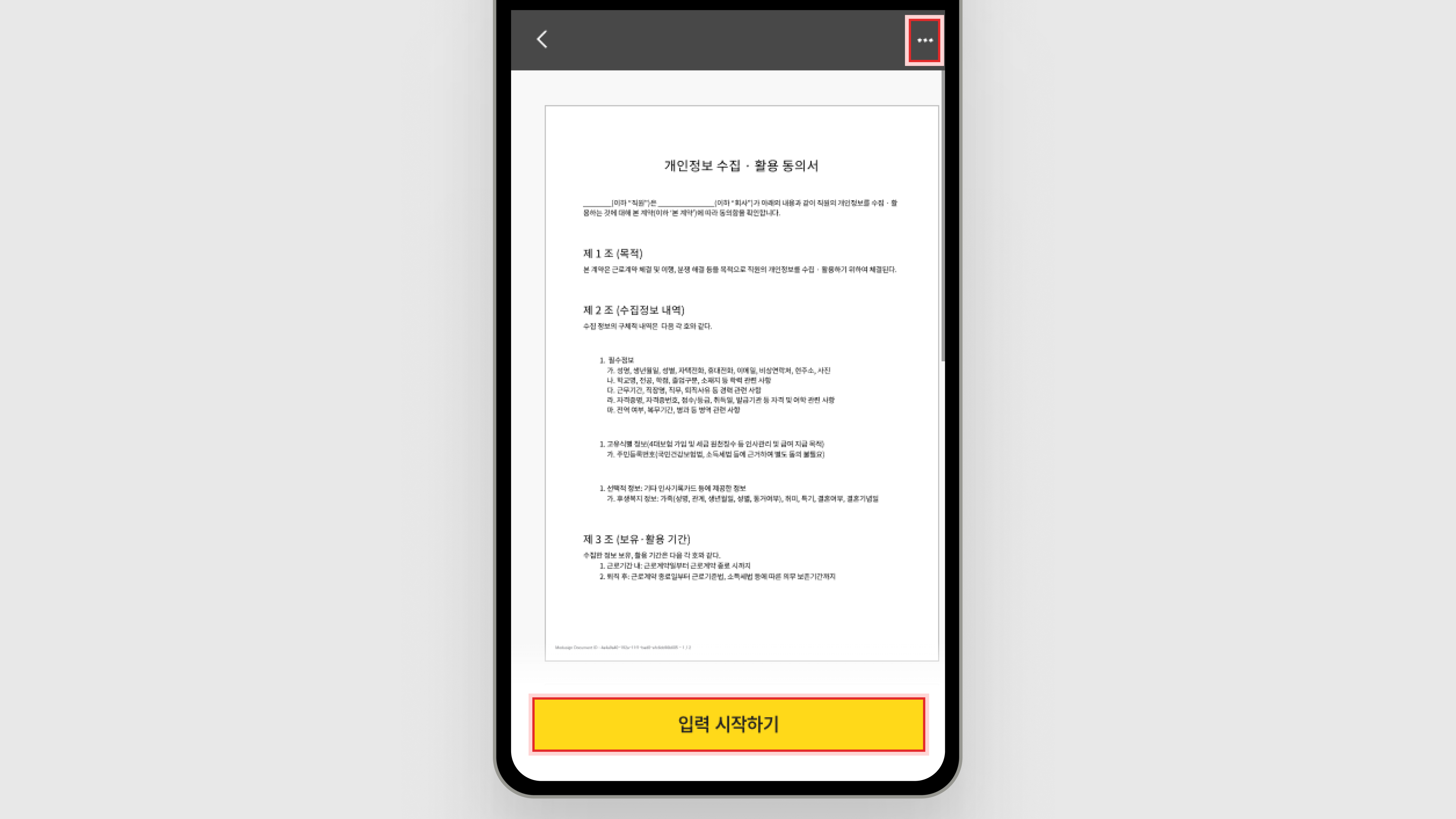 문서 본문이 나타나면, 내용을 확인하고 [입력 시작하기] 버튼을 클릭하여 서명을 진행하거나,