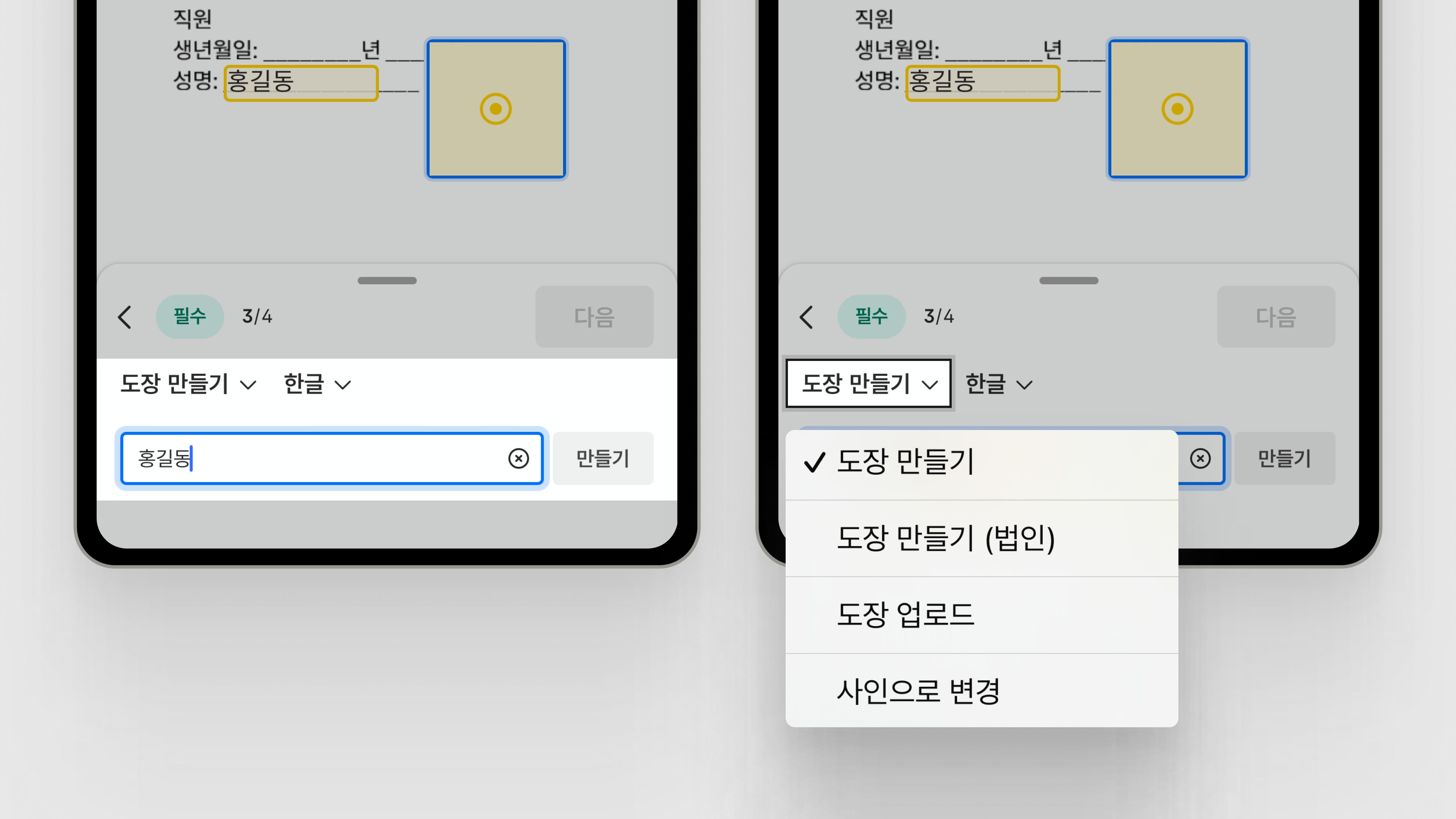 도장으로 변경 : 도장 입력 방식으로 변경할 수 있습니다.