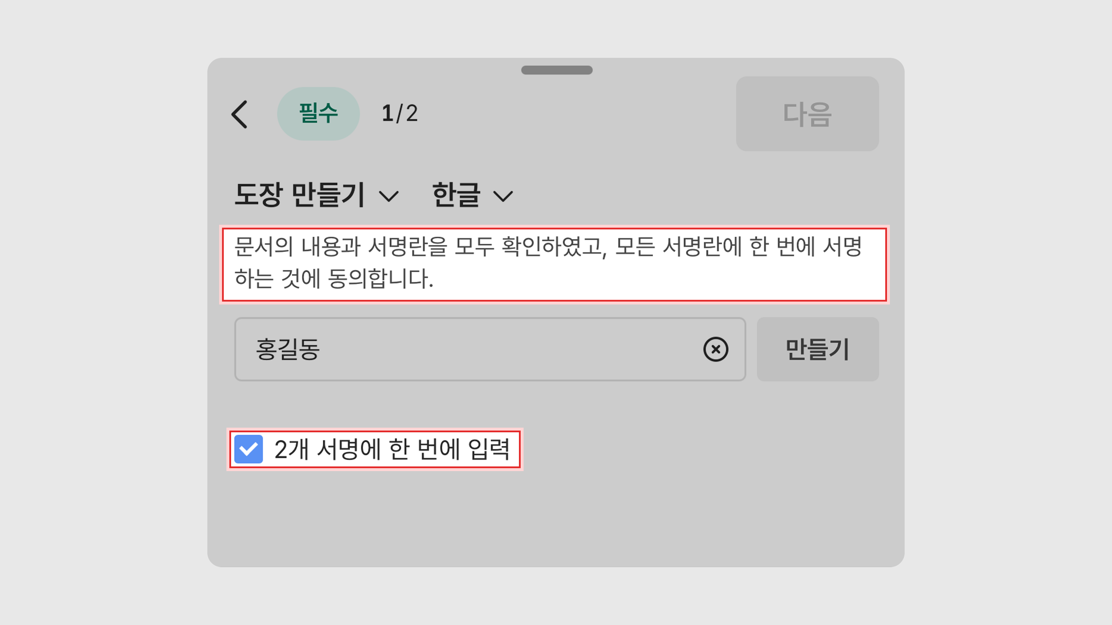 이 옵션을 선택한 뒤 사인 또는 도장을 입력하면, 문서 내 모든 사인/도장 입력란에 한 번에 날인할 수 있어 보다 빠르게 서명을 완료할 수 있습니다.