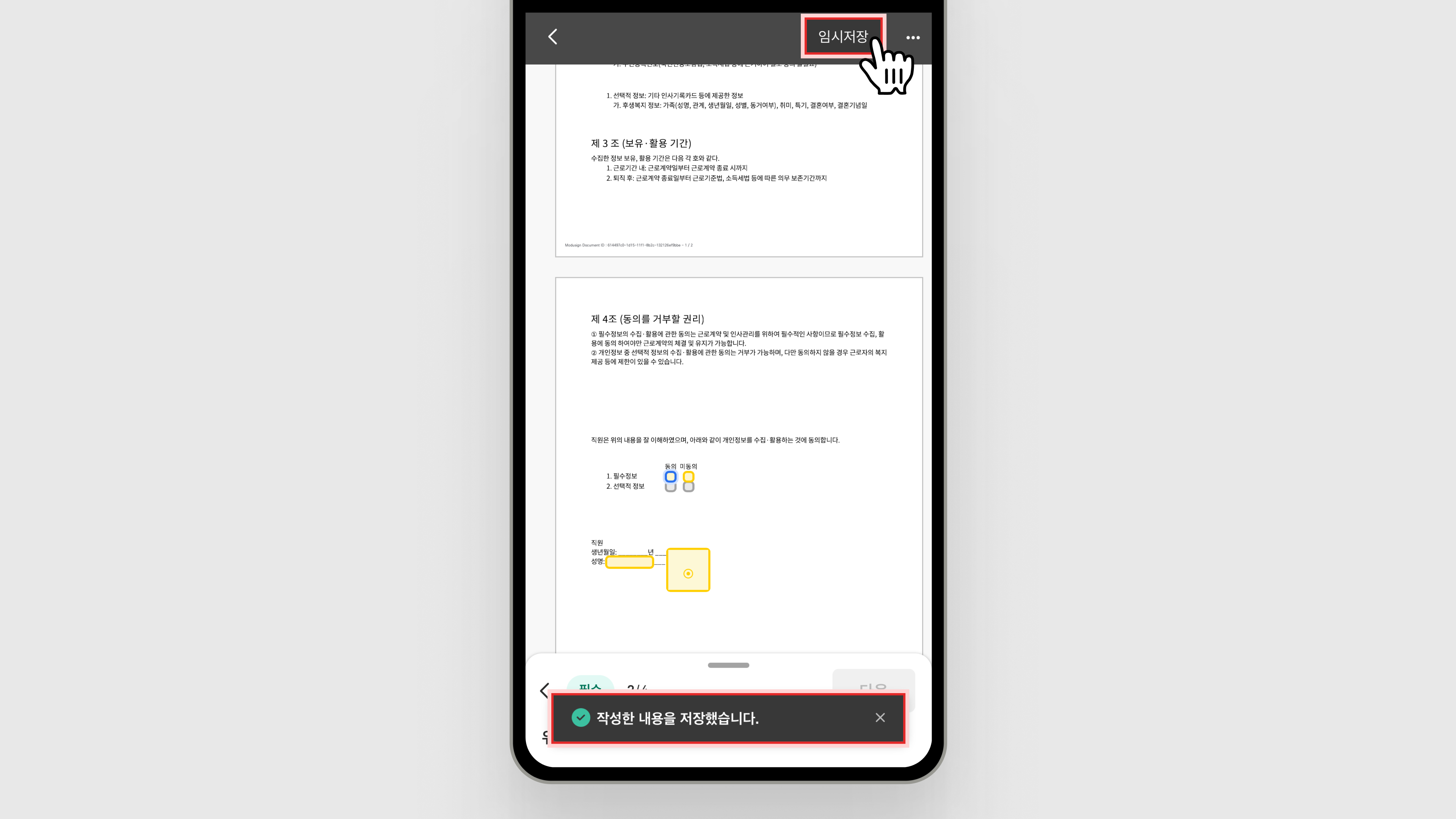서명 중 [임시저장] 버튼을 눌러서 중간 저장할 수 있습니다.