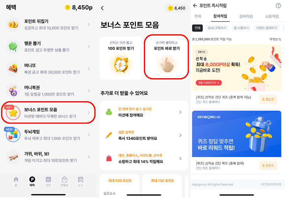 [혜택] 탭 > [보너스 포인트 모음] > [참여 적립] 선택