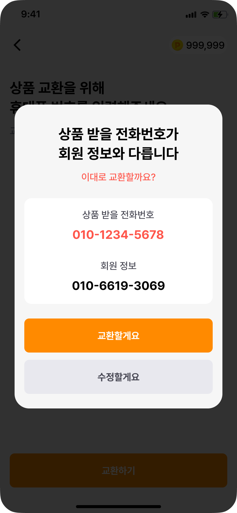 ๋ค๋ฅธ ๋ฒํธ๋ฅผ ์ ๋ ฅํ์ ๊ฒฝ์ฐ, ์๋์ ๊ฐ์ด ํ์ธ์ฐฝ์ด ์ ๊ณต๋๋ฏ๋ก ๋ฐ๋์ ํ์ธ ํ ๊ตํ ๋ฐ ์์ ์ ์งํํด ์ฃผ์ธ์.