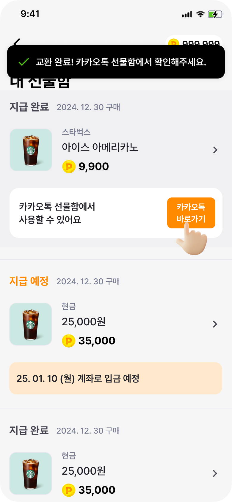 ์นด์นด์คํก ์ ๋ฌผํ๊ธฐ๋ฅผ ํตํด ๊ตฌ๋งคํ์ ์ฟ ํฐ์,์ ๋ ฅํ์ ์ ํ๋ฒํธ๋ก ๊ฐ์ ๋ ์นด์นด์ค ๊ณ์ ์ผ๋ก ๋ฐ์ก๋ฉ๋๋ค.