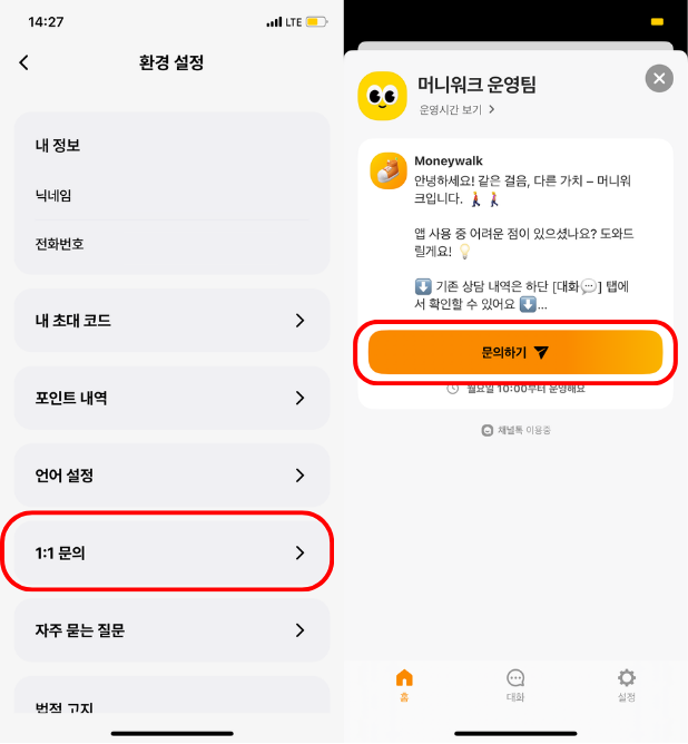 머니워크 홈 화면 > 우측 상단 모양의 [설정] > [1:1 문의]에서 가능합니다!