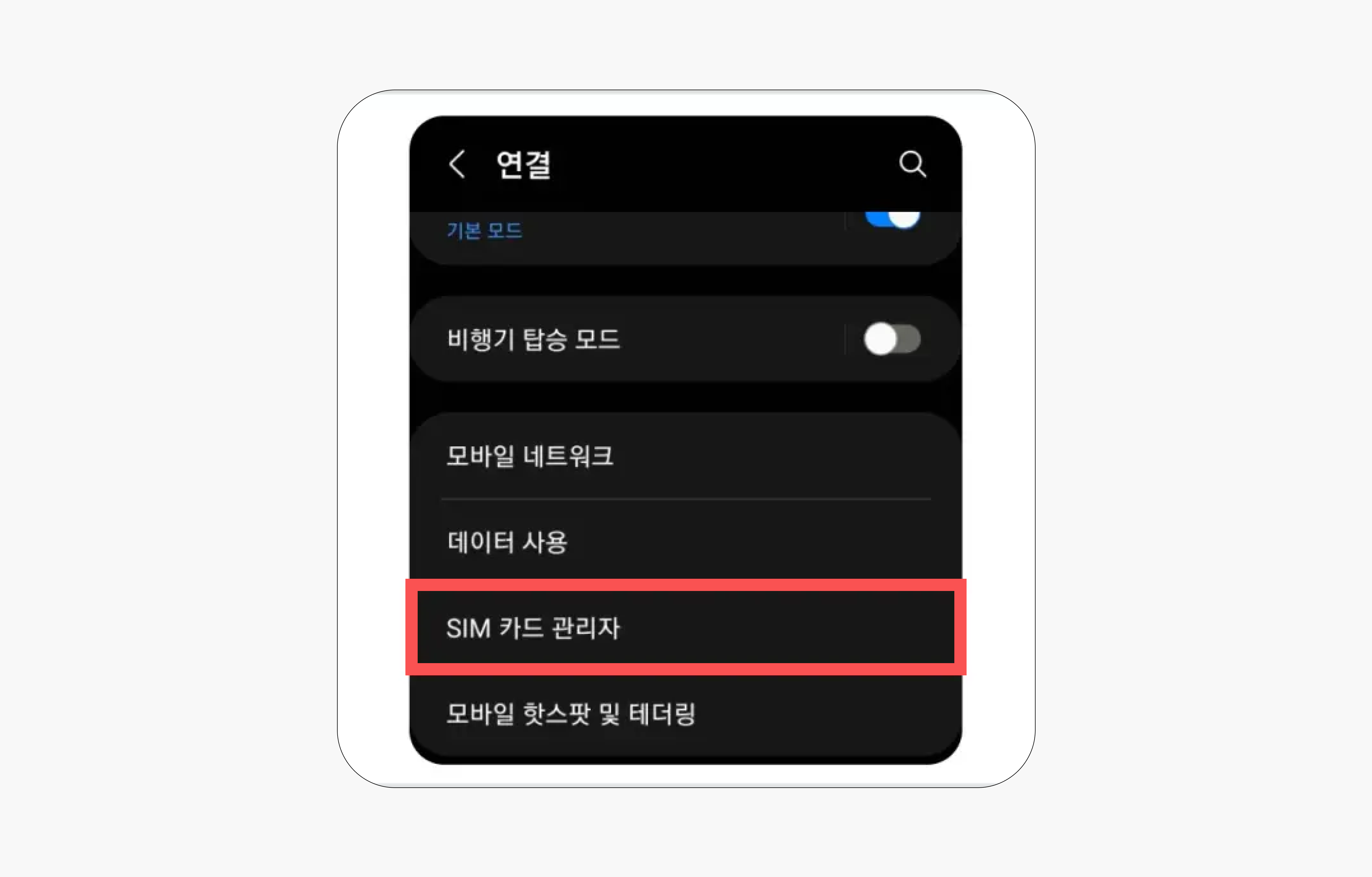 설정 → 연결 → SIM 카드 관리자 화면을 눌러주세요.