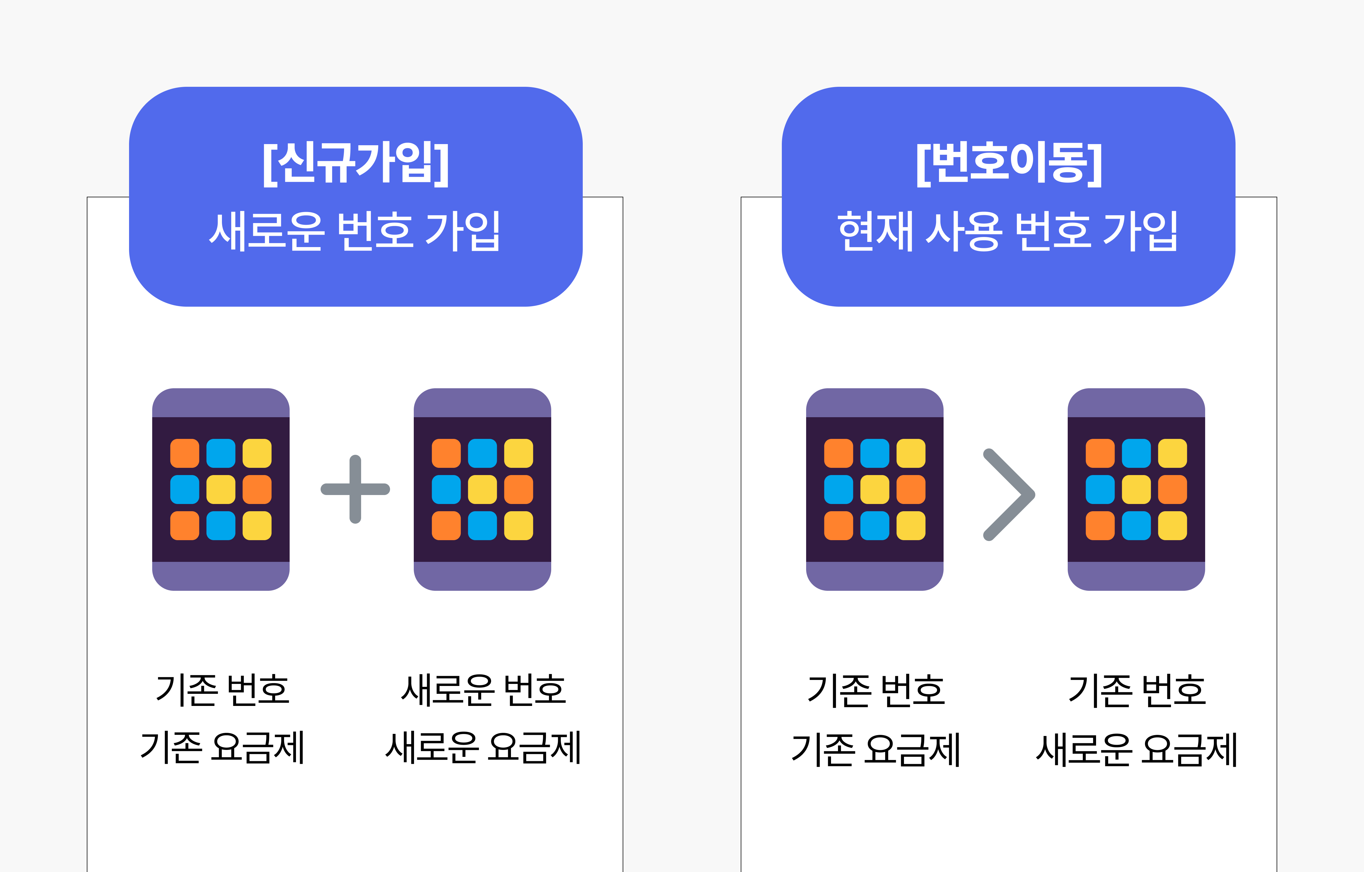 신규가입: 사용 중인 번호 외에 새로운 번호로 가입하고 싶어요. (기존 휴대폰 번호와 무관)번호이동: 사용 중인 번호는 유지하고 요금제만 변경하고 싶어요. (기존 휴대폰 번호 변경 X)