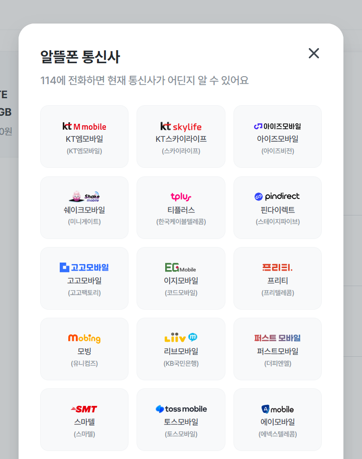 첫 화면에서 사용 중인 통신사가 없을 경우, 아래로 스크롤을 내려서 모든 통신사를 확인해 주세요.