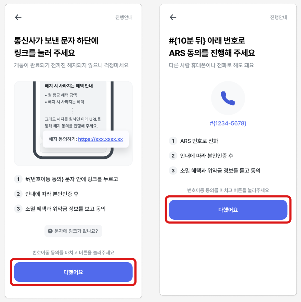 사전동의 문자 화면에서 [전화로 동의] 버튼을 눌러 ARS(전화)로 진행해 주세요.