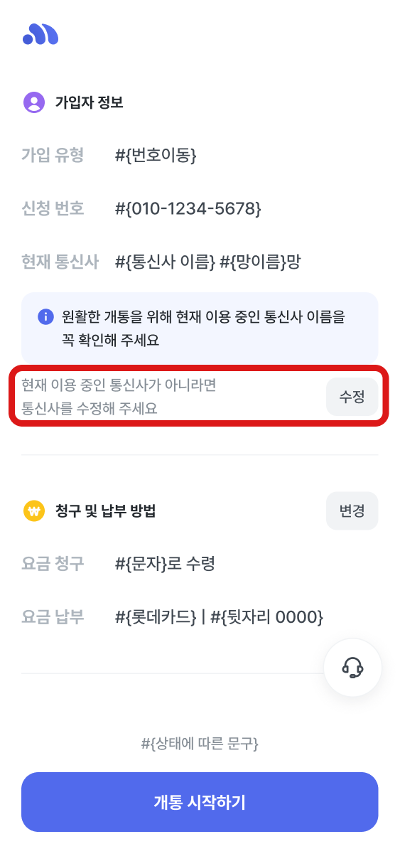 해당 화면에서 통신사 수정 후에 개통 이어서 진행하시면 돼요.