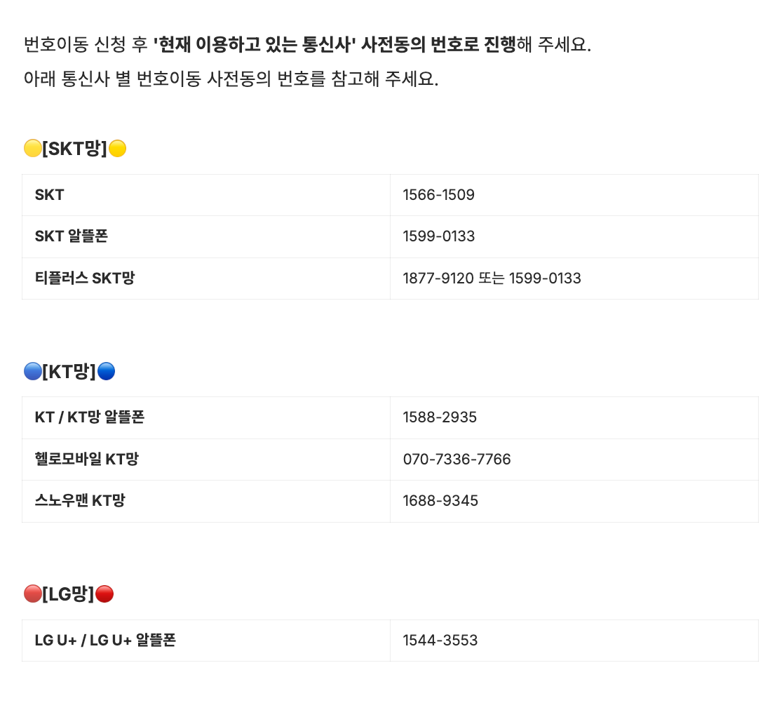각 통신사 고객센터는 아래 정보를 참고해 주세요. (가나다순)
