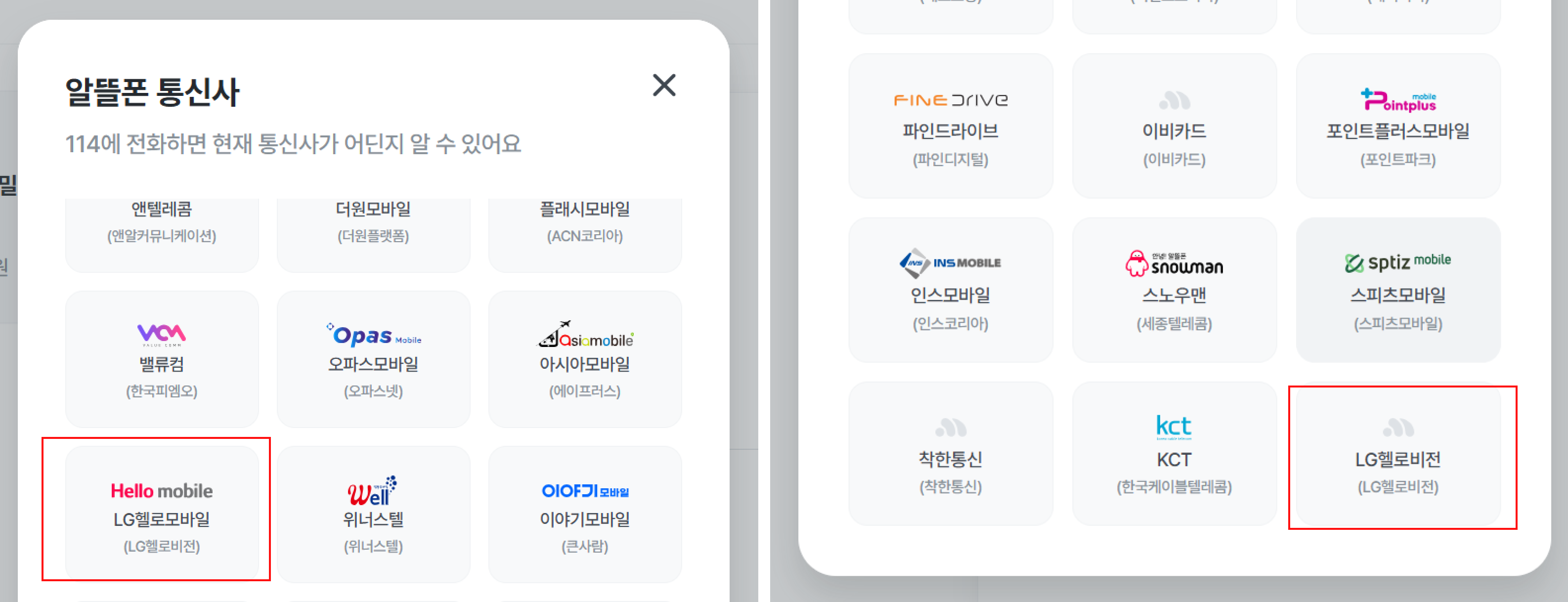 → 그렇다면, 'LG헬로모바일' 또는 'LG헬로비전KT'를 선택하여 진행해 주세요.