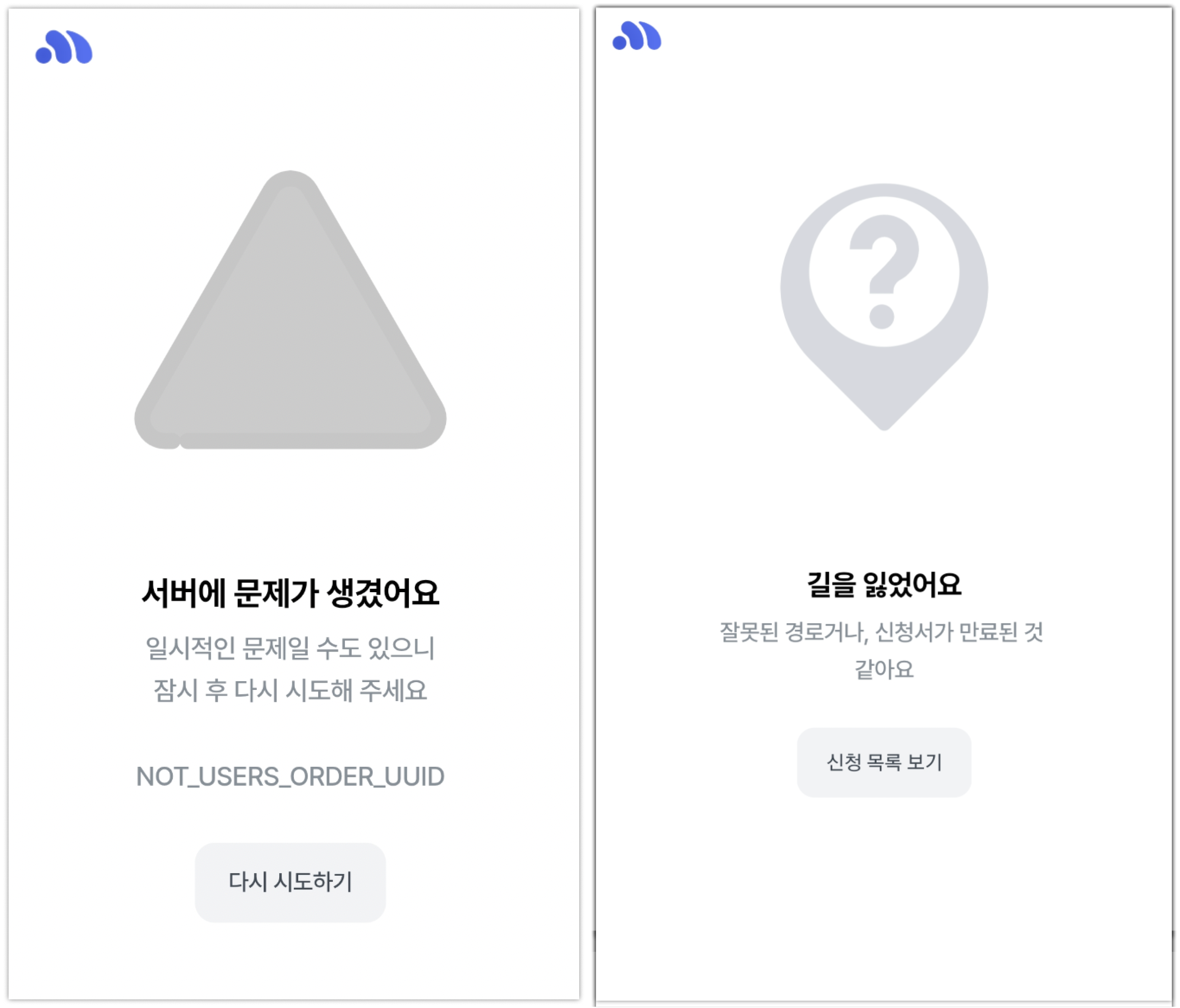 아래와 같이 '서버에 문제가 생겼어요 (NOT_USERS_ORDER_UUID' 또는 '길을 잃었어요' 라는 문구가 보인다면 다른 모요 계정에서의 신청 건이에요.