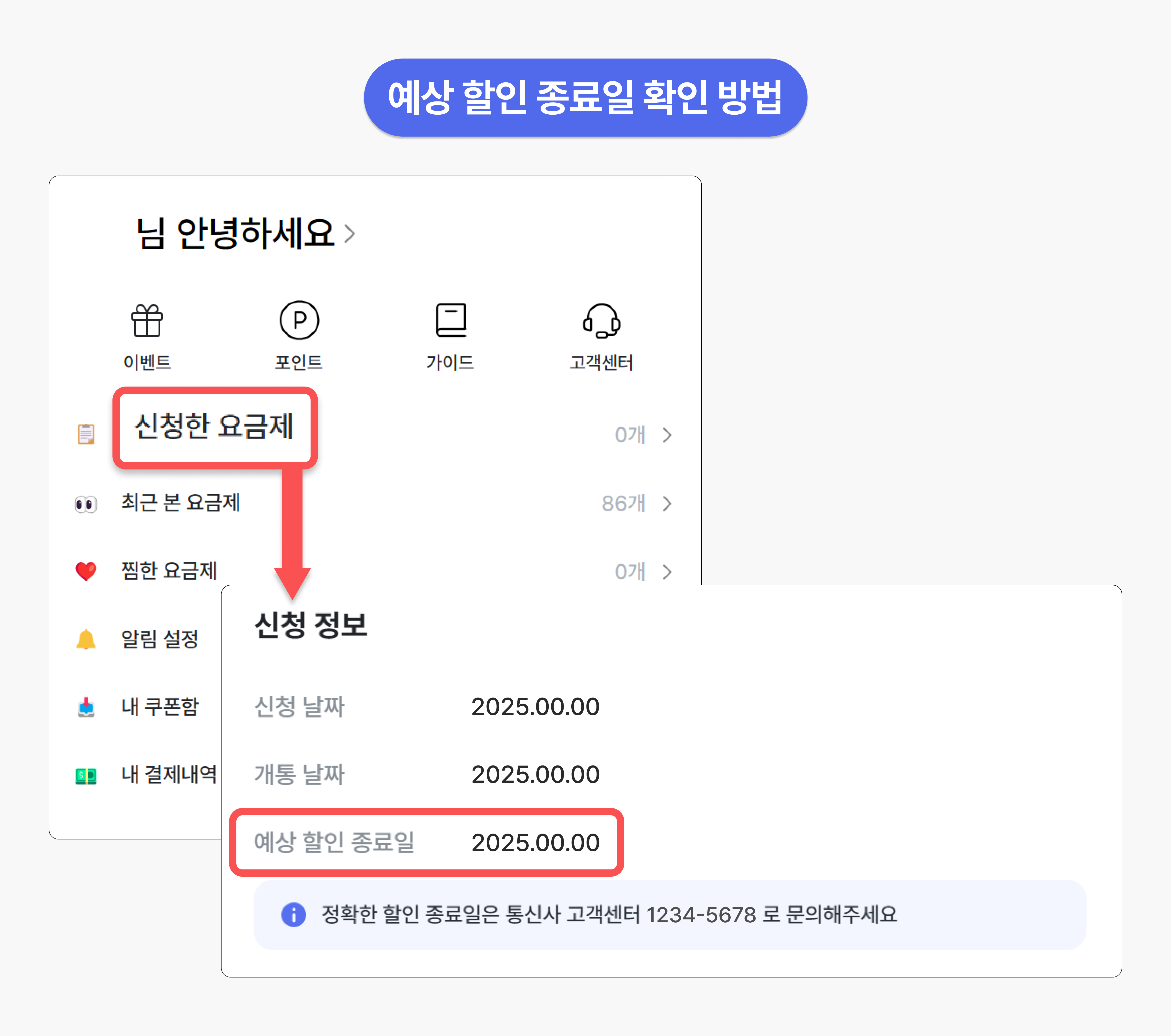 마이페이지 > 신청한 요금제 > 신청 내용 자세히보기 > 예상 할인 종료일 확인
