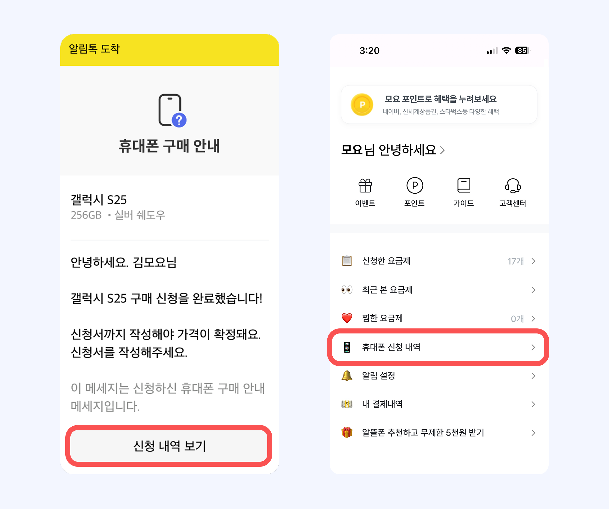휴대폰 구매 신청 내역과 진행 현황은 아래 두 가지 방법 중 하나로 확인할 수 있어요.