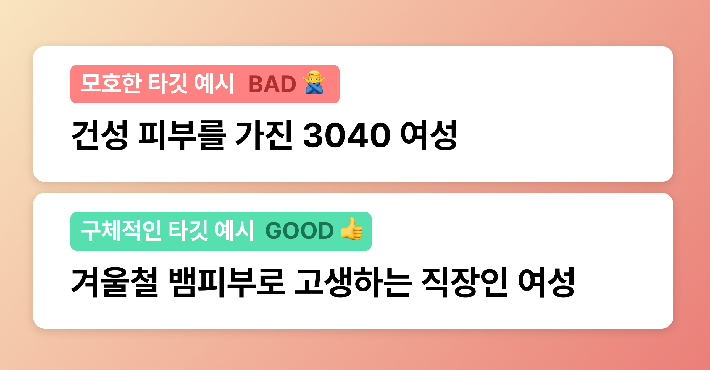 "20~40대 모든 여성에게 어필해 주세요." 타겟이 너무 넓으면 결국 아무에게도 제대로 어필하지 못합니다. 명확한 타겟이 있어야 메시지도 명확해집니다.